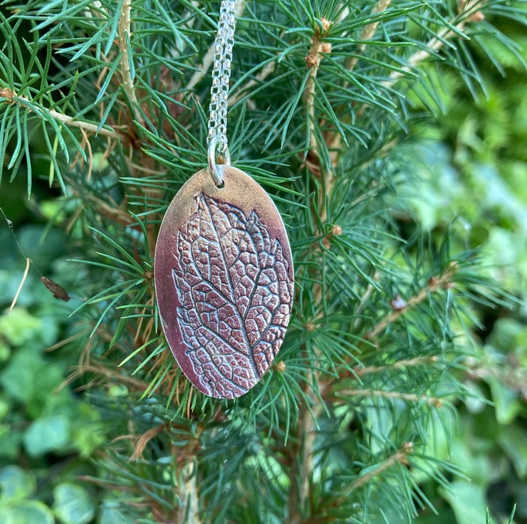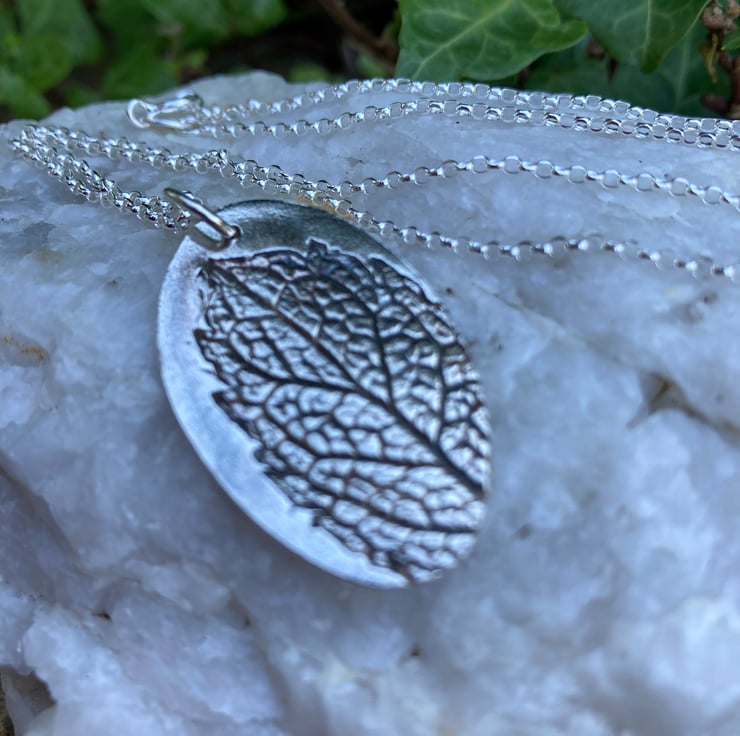 The pendant has been oxidised to show the detailed pattern of the mint leaf to full effect.