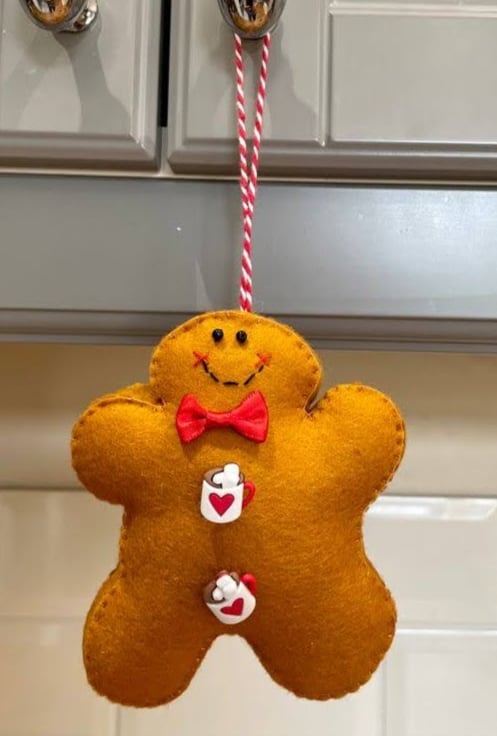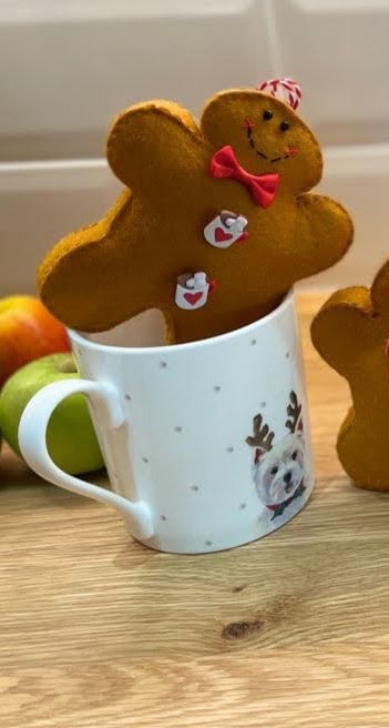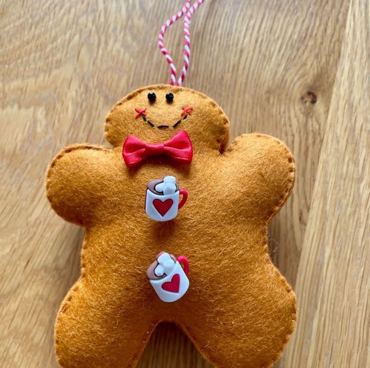 Another new Christmas felt gingerbread hanging decoration. The gently rounded belly of this little man betrays his love of a steaming cup of hot chocolate, topped off with whipped cream and squishy mallows. Wearing a scarlet bow tie and coordinating buttons this fella is full of the goodies but none of the calories!