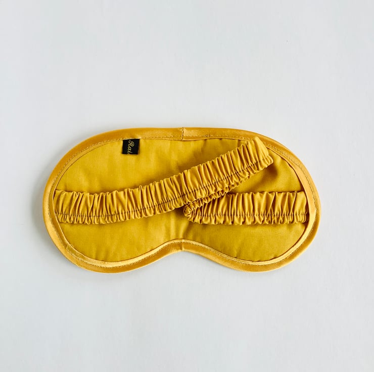 The eye mask has a covered elasticated strap, it is lined with 100% soft cotton, filled with padding made of 100% cotton and finished with the 100% cotton satin bias-binding tape.