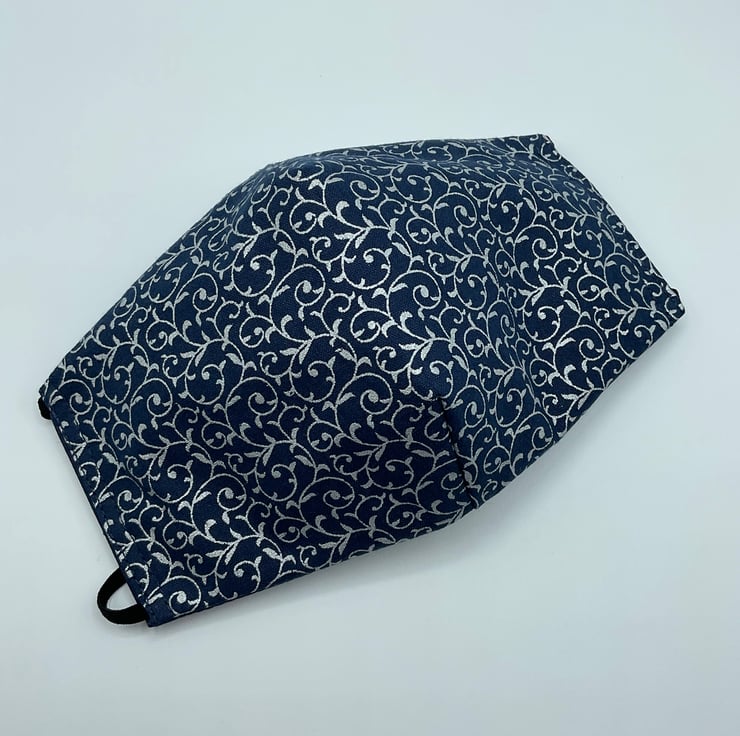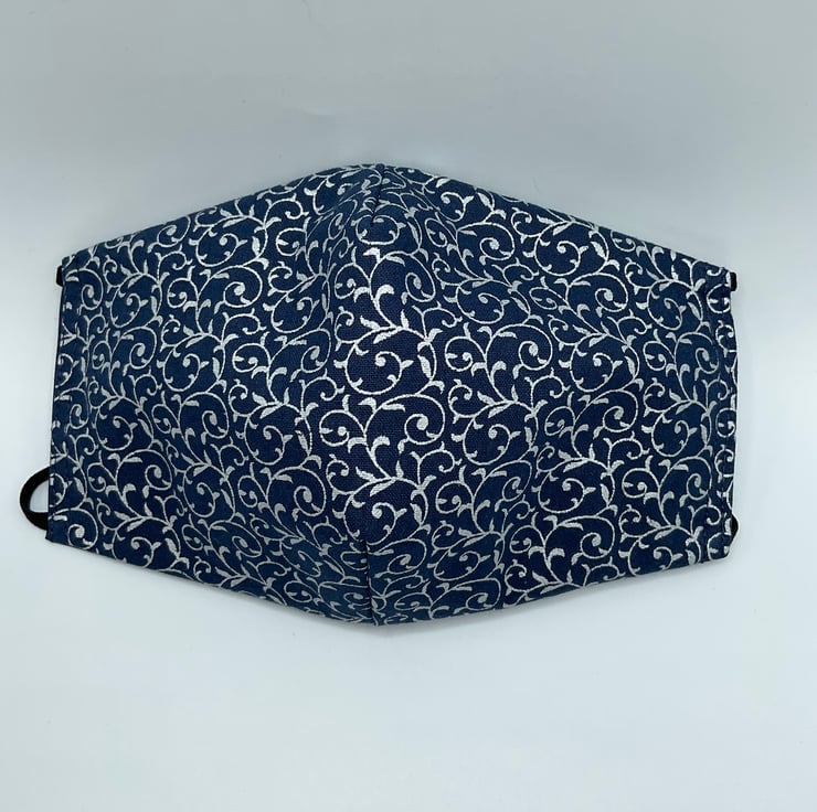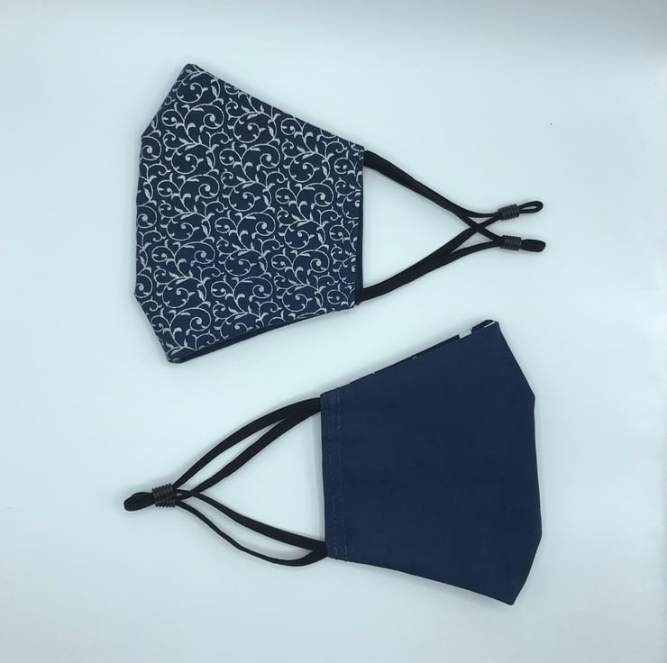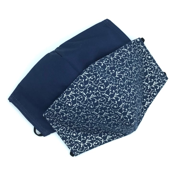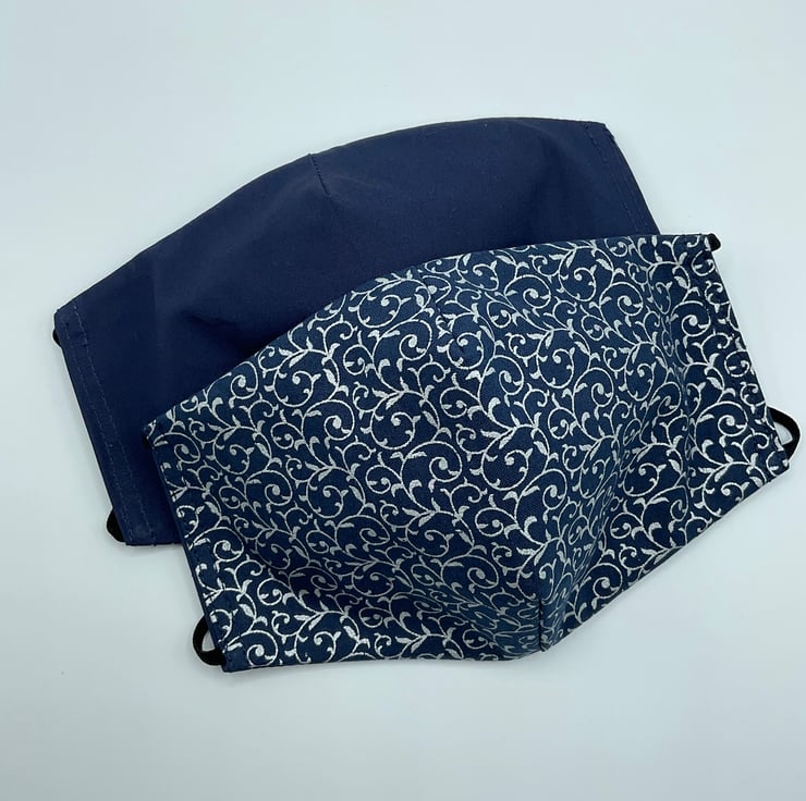 These masks are double-sided with an option for wearing as a patterned navy with silver swirls mask or plain navy blue. The swirls are a very discreet metallic silver.
