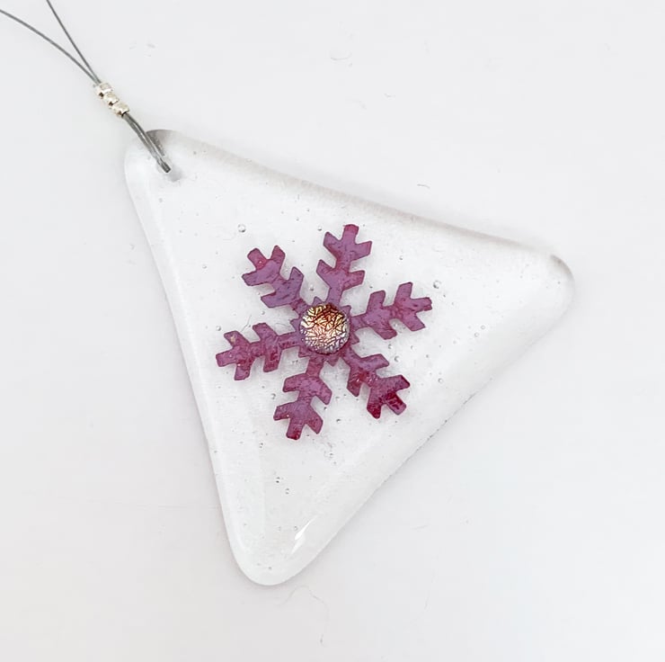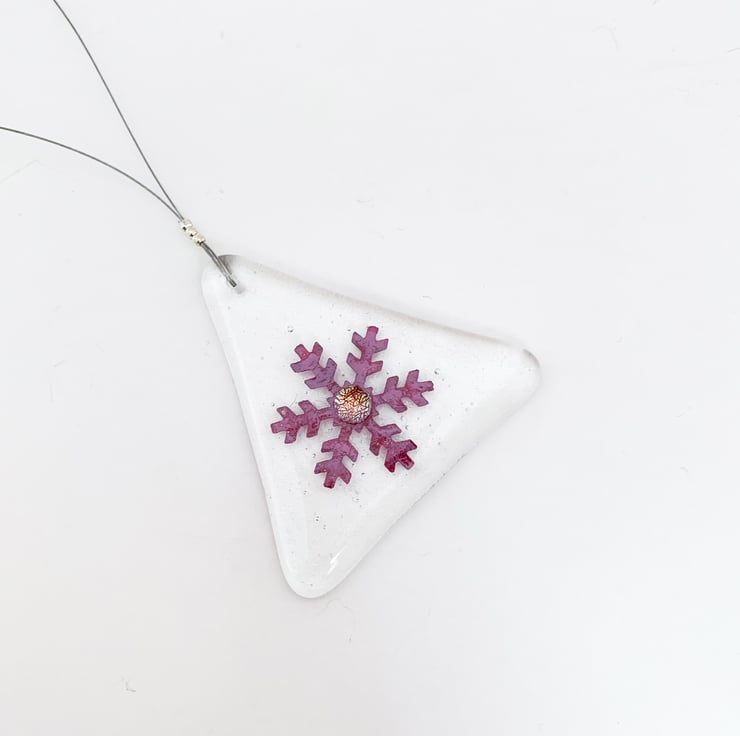 Mini fused glass snowflake hanging decoration. Featuring copper foil snowflake. These hangings make wonderful small postable gifts and look lovely when hung in a window.