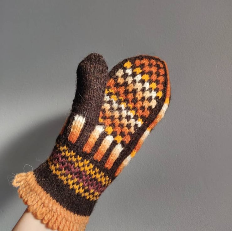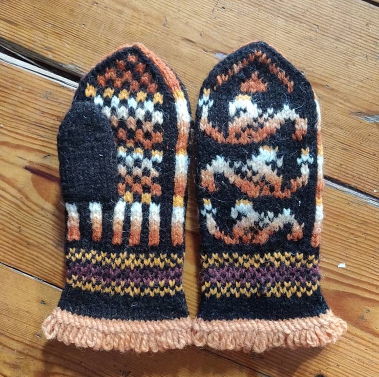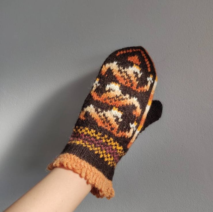 Hand knitted wool mittens in a traditional fairisle pattern. Dark brown, orange and white.