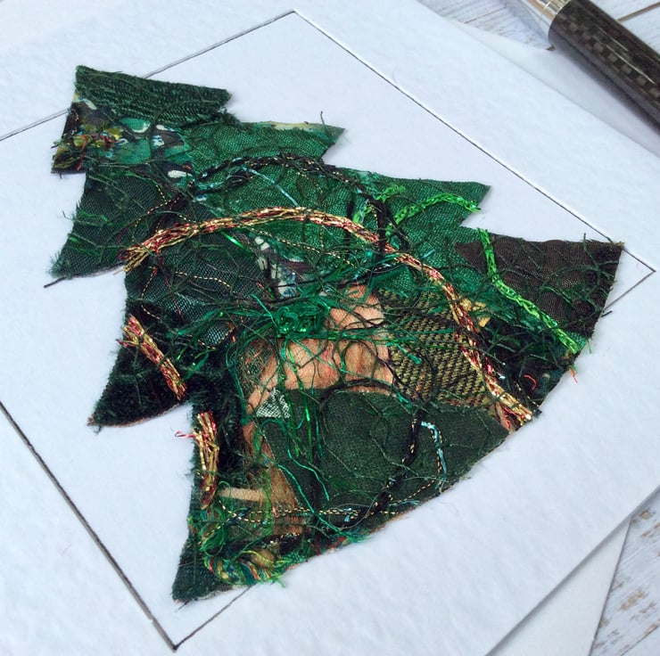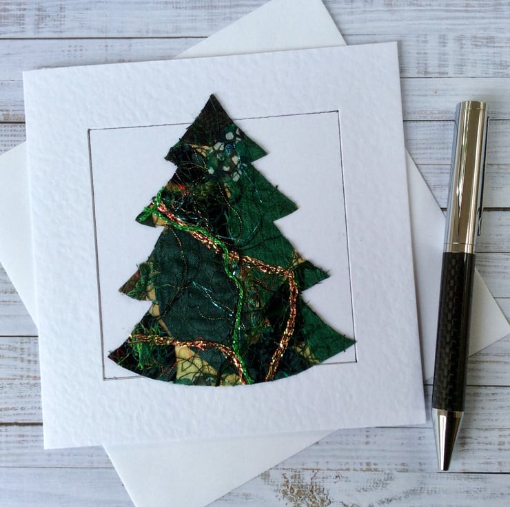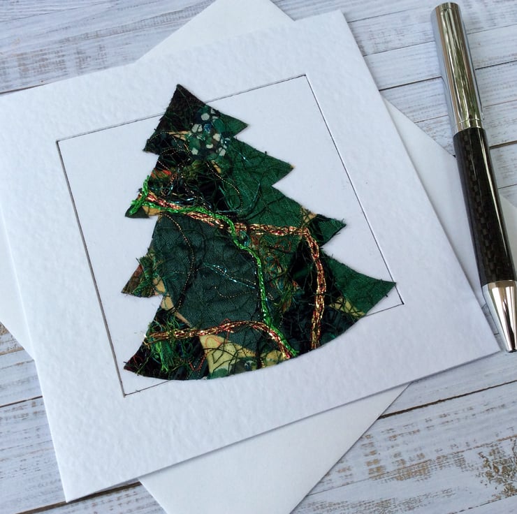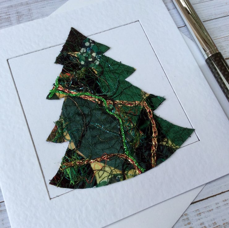 This embroidered Christmas tree has been made with my own handmade up-cycled fabric. This dramatic fabric contains silk, merino wool, threads, cottons and netting and it’s been enhanced with free motion embroidery. It’s perfect for a season greetings, Christmas or for someone very special. This Hammer White Card is blank inside, measures 14.5 x 14.5cm, comes with an envelop and in a plastic cover for protection. The tree measures 9 x 11cm approx. Each card will have a slightly different arrangement of the fabrics etc.