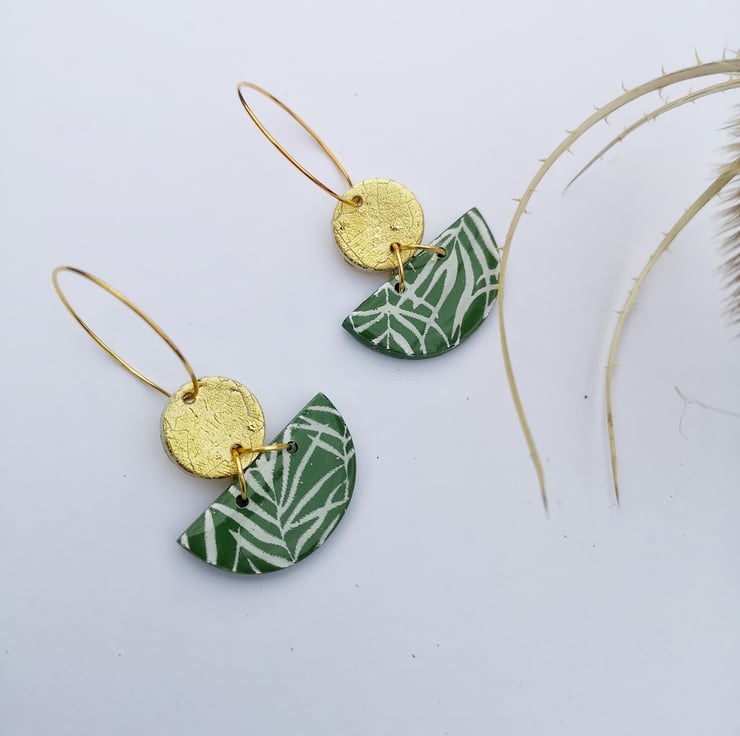 Semi circle olive green and white fern pattern with a gold leaf foil small circle mounted by double gold jump rings