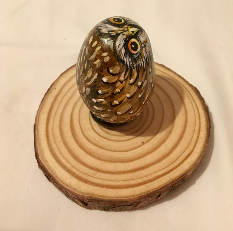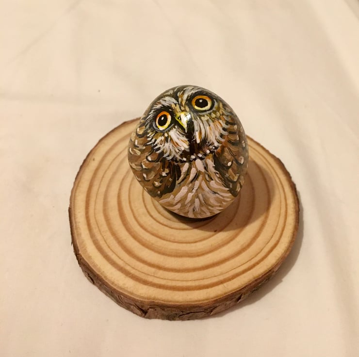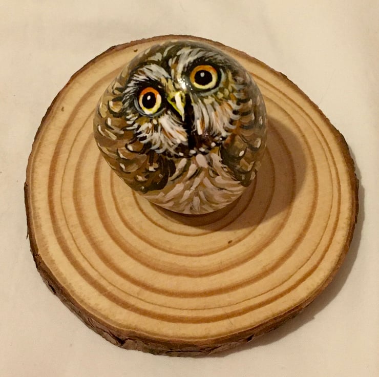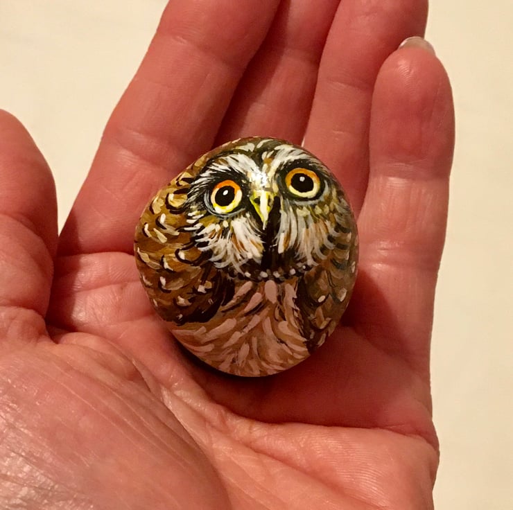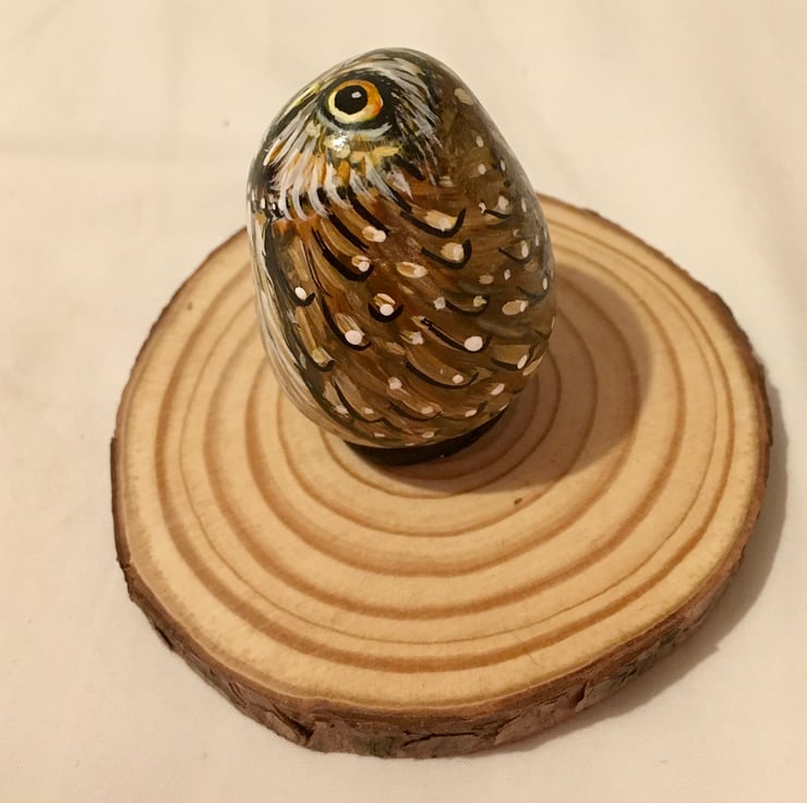 This little owl has been painted onto a smooth stone and glazed for a glossy protective finish