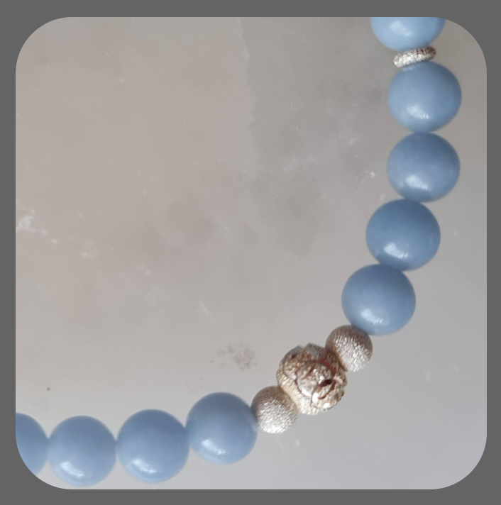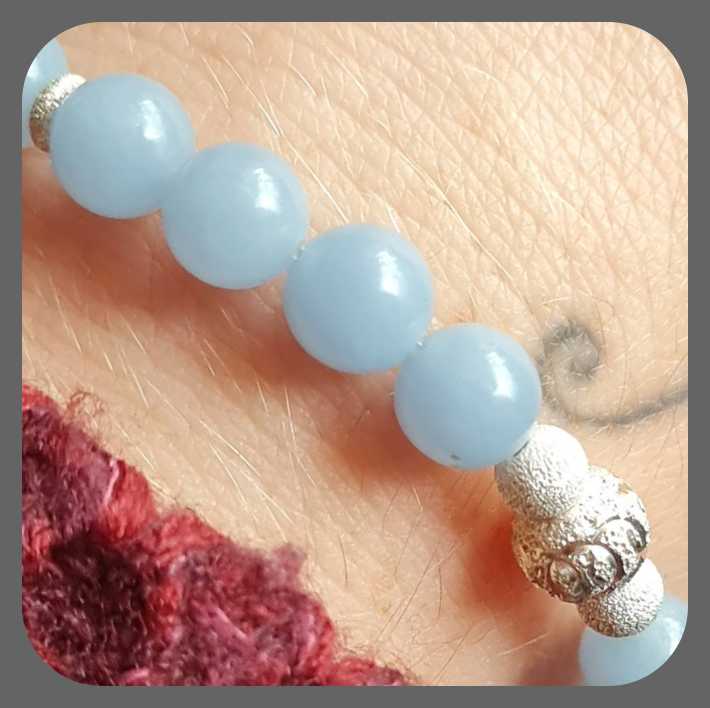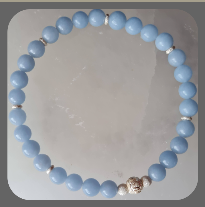 The Angelite beads are about 5mm, the silver big stardust bead is 5mm, the stardust beads are 4mm, and the little spacers are 2mm. The bracelet measures approximately 7 inches. As it is elasticated, it is best to roll it on and not pull.