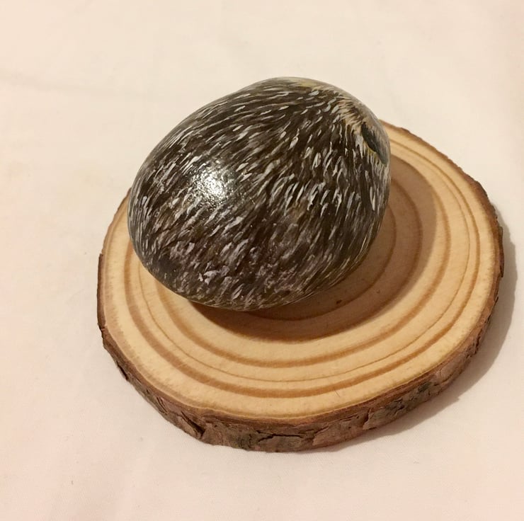This little hedgehog has been painted onto a smooth stone and glazed for a glossy protective finish with two little clay front feet.