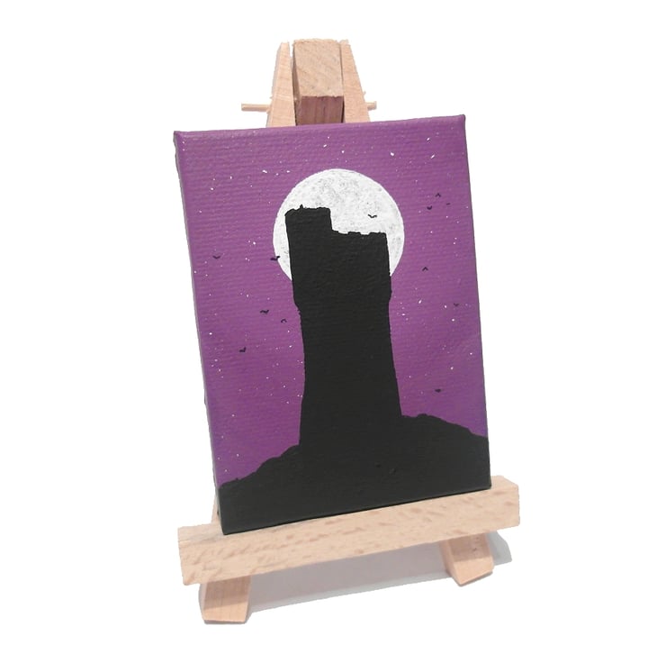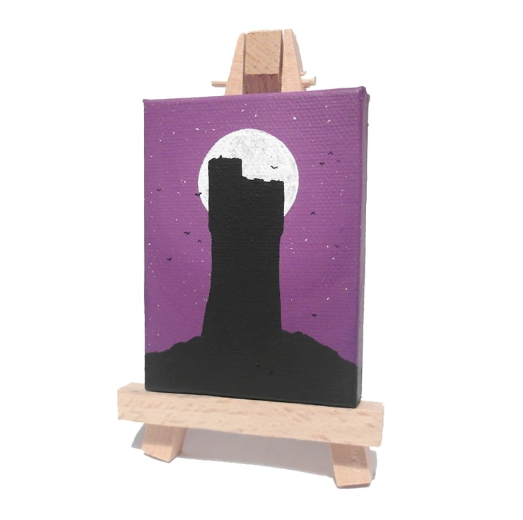 The spooky Castle Hill scene is painted in acrylics on a 6cm x 8cm mini canvas, and as the canvas is so small it has been signed and dated on the back. The original painting will come with a 12cm (4.7") wooden easel for display.