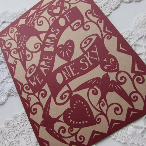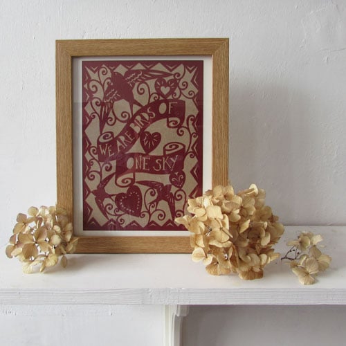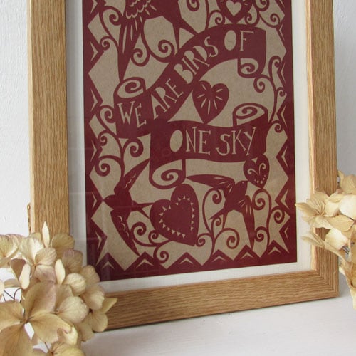 A5 print digitally printed from an original design featuring the words “we are birds of one sky” and two flying swifts.
