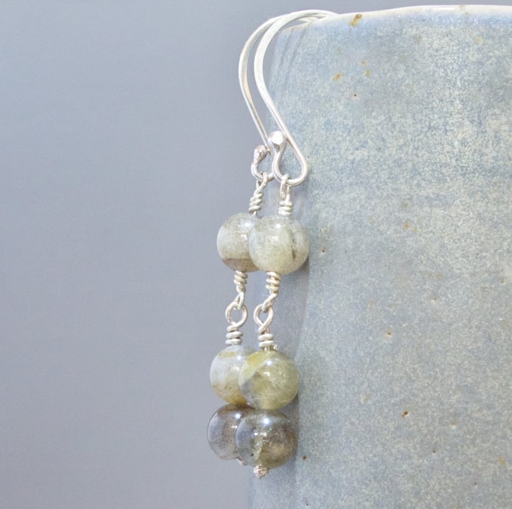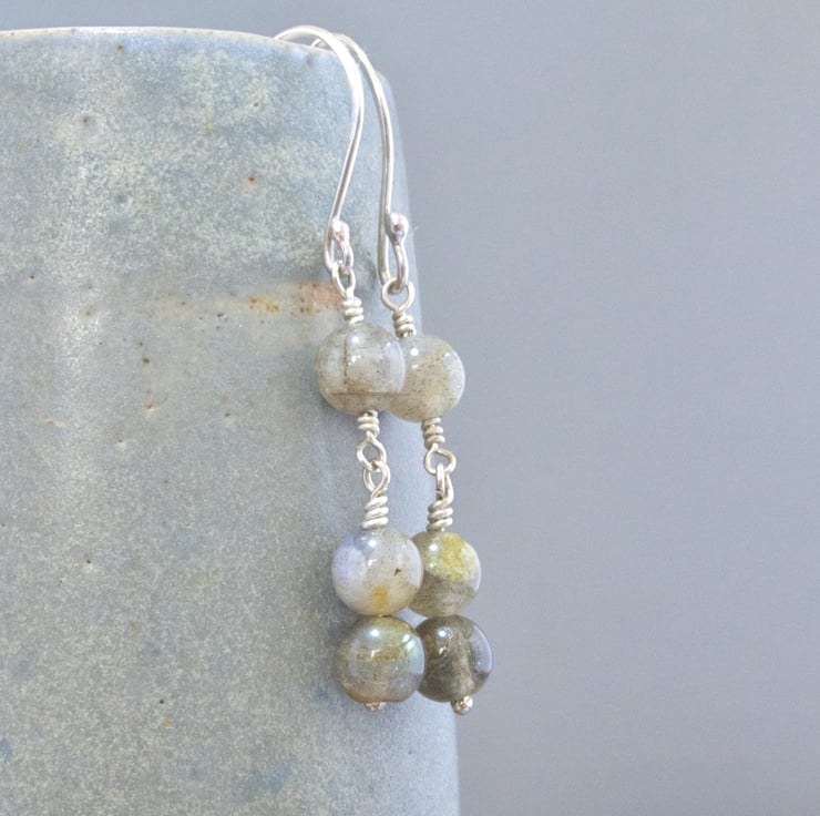 Labradorite is a semi-precious gemstone which is called the "dreamers' stone" and has the most unusual quality of being able to produce flashes of intense purple, blue, green and gold light from its warm pewter grey base colour. These unexpected colours are very difficult to photograph and are at their best in strong sunlight or under electric lighting. This minimalist design uses a pair of labradorite gemstone beads contrasted with a solo bead in order to create dramatic tension out of simplicity. Each crystalline gem is mounted on wrapped loops of thick, highly polished sterling silver wire and features ear fixings hand crafted in my East Sussex workshop. Each earring measures 47 mm or 1 3/4" in length.