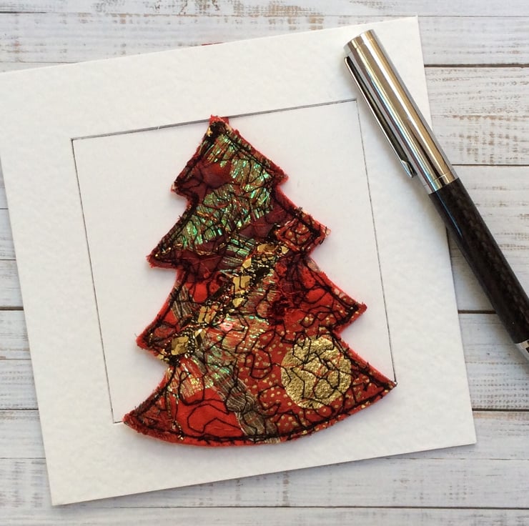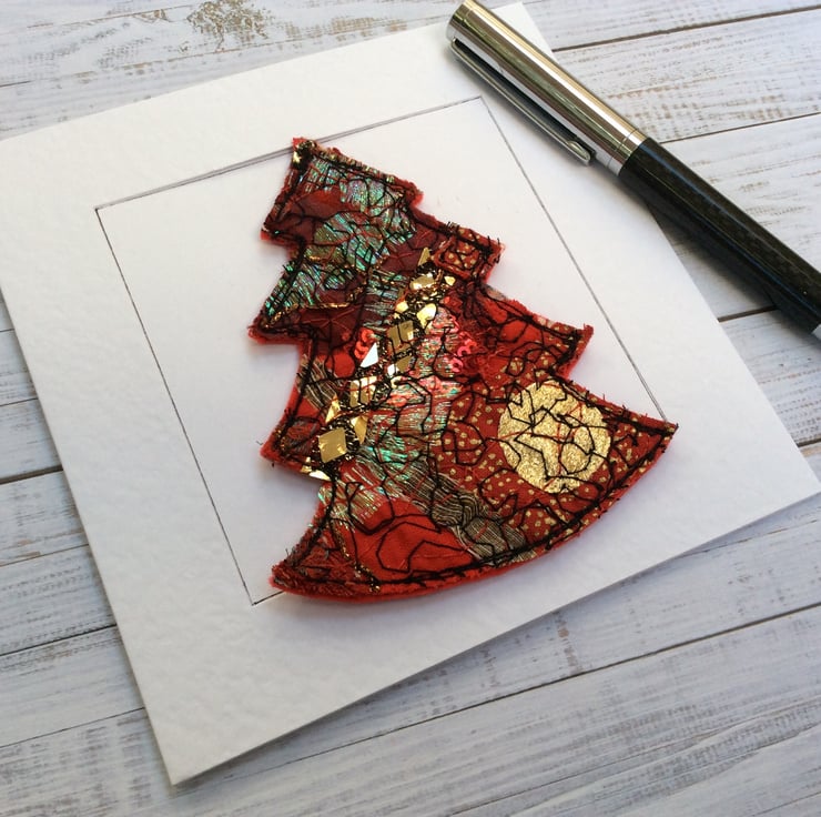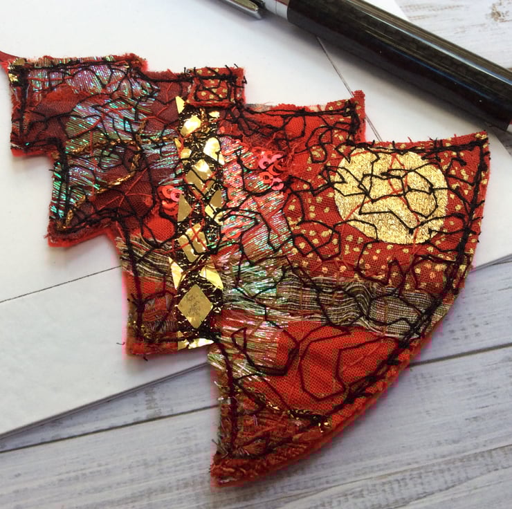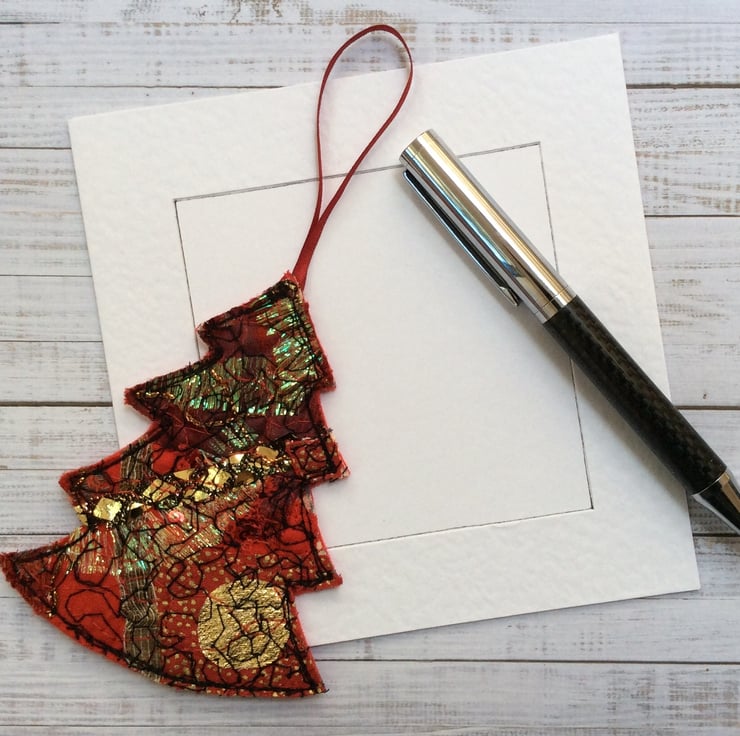 This embroidered Christmas tree card is also a Christmas decoration. Its been made with my own handmade up-cycled fabric. This dramatic fabric contains silk, wool, threads, cottons, sequins and netting etc. and is enhanced with free motion embroidery. It’s perfect for a season greetings or a special Christmas card. The tree is easily detached from the card with a ribbon for hanging.