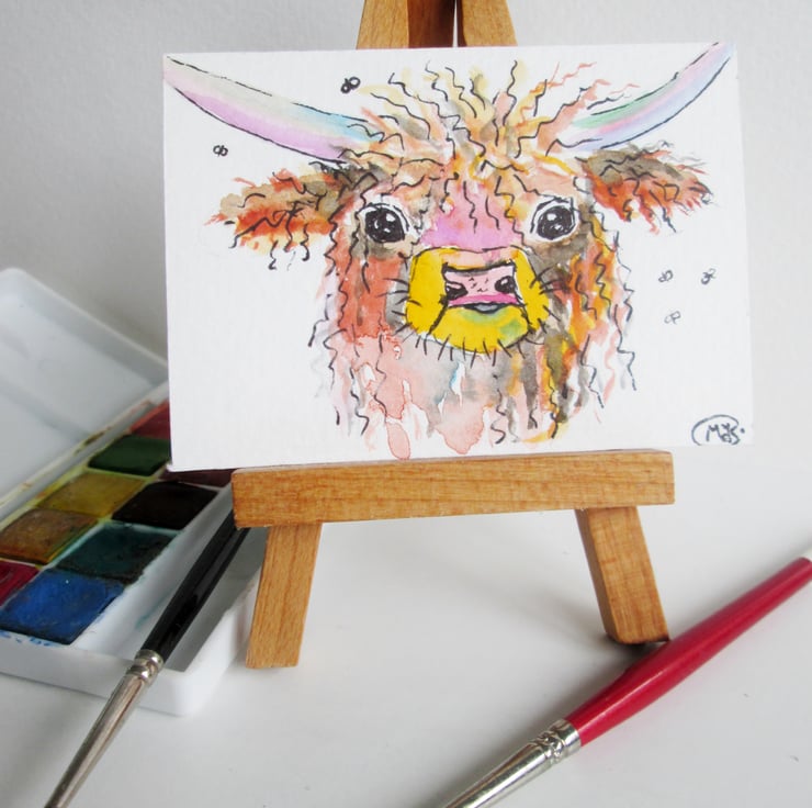 Cute Highland Cow ACEO, miniature original painting
