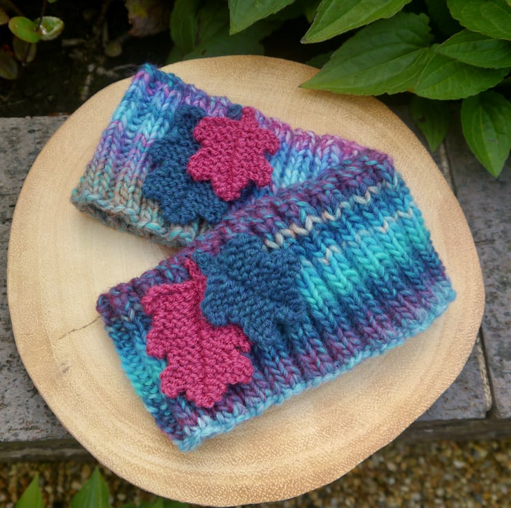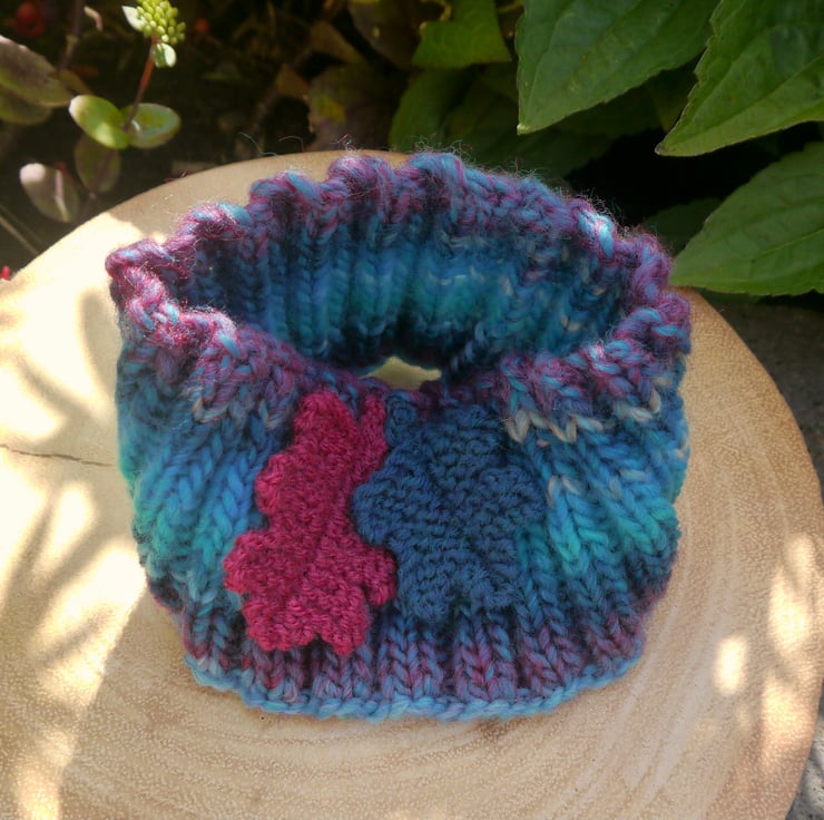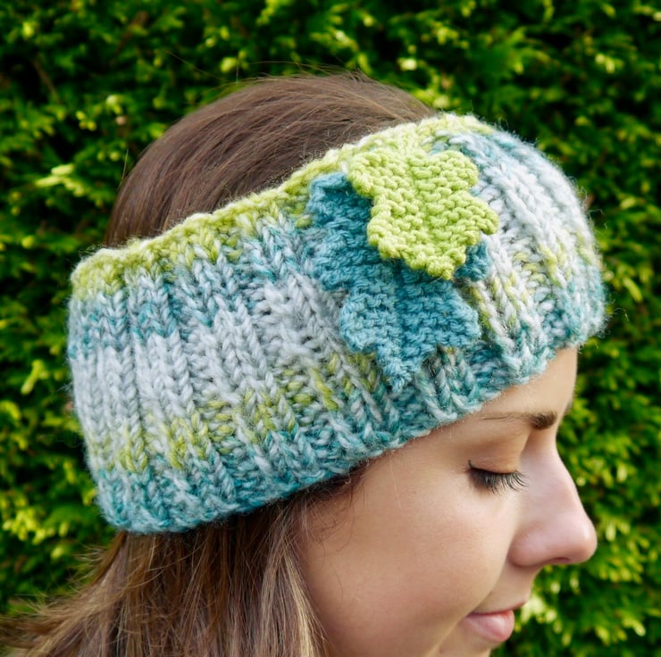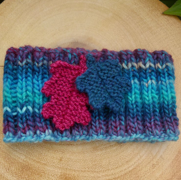 I have attached two hand knitted oak leaves in complementary colours, the large leaf is fuchsia pink and the small leaf is teal. Made with a marble effect good quality wool mix yarn. I have knitted this on a circular needle so there are no seams. The ribbed effect means that it is very stretchy and will fit most head sizes, from older child to adult. It measures approx. 9cm deep and is about 40cm around when not stretched.