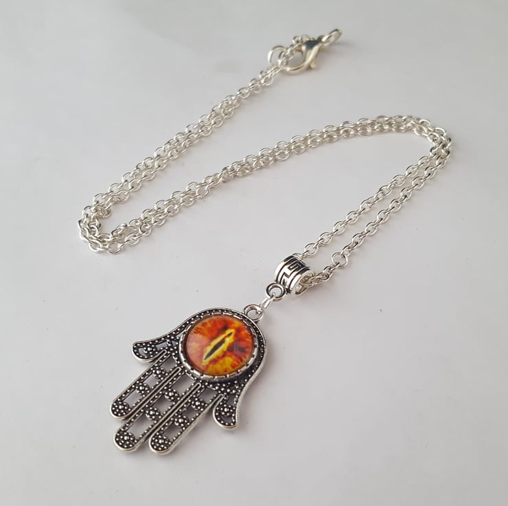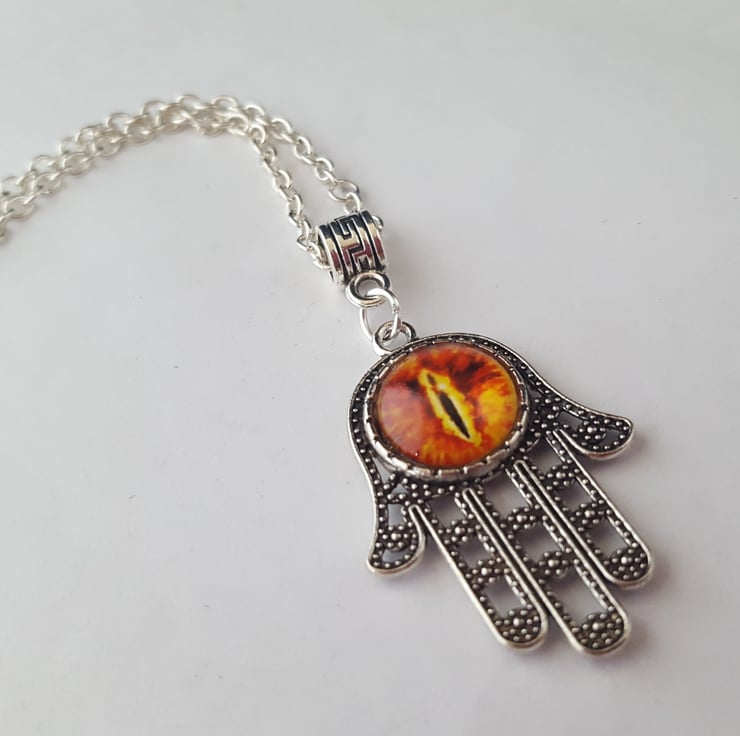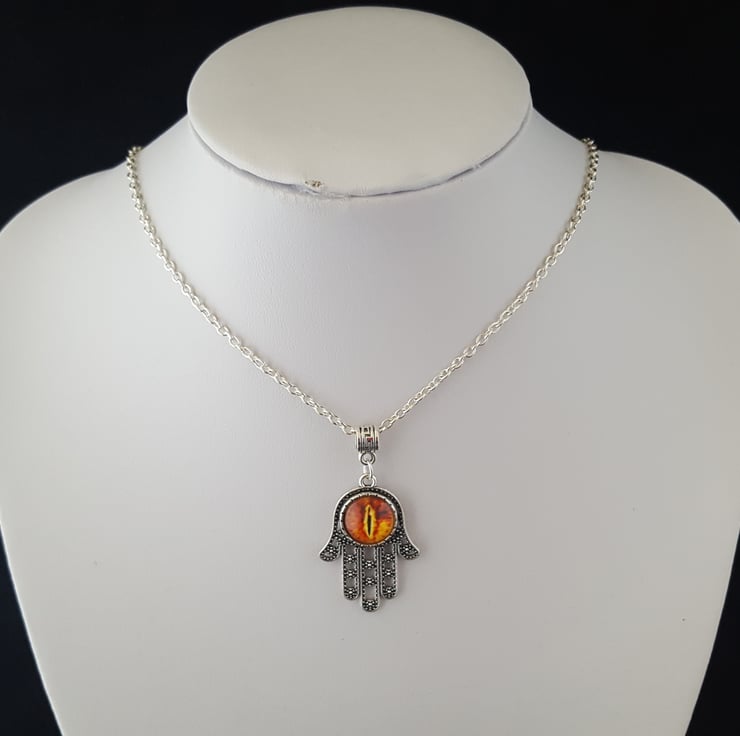 Tibetan silver Hamsa hand pendant (30x23mm) with orange glass dragon eye cabochon, on an 18" silver tone chain. In an organza gift bag.