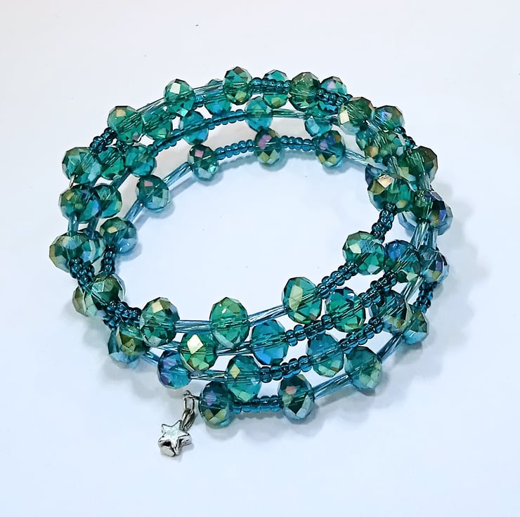 This lovely bracelet is made from memory wire strung with green crystal beads interspersed with glass seed and tube spacer beads. The bracelet is finished with a small tibetan silver star charm.