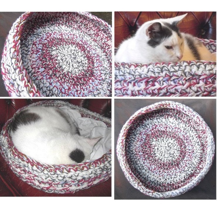 This pattern covers three sizes, so you can crochet the basket for a small or medium cat, large cat / tiny dog, or extra large cat / small dog.
