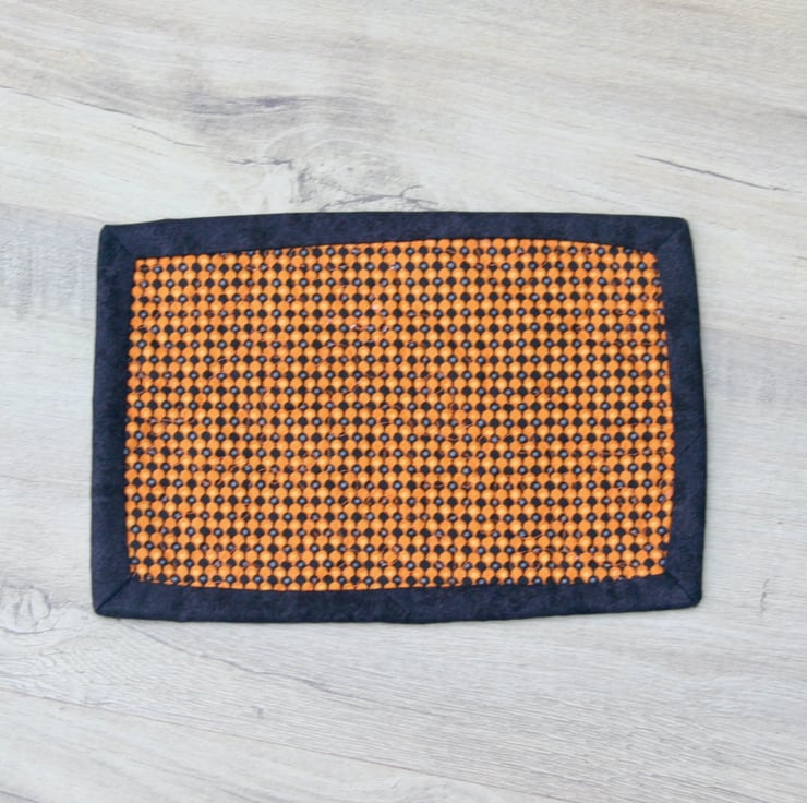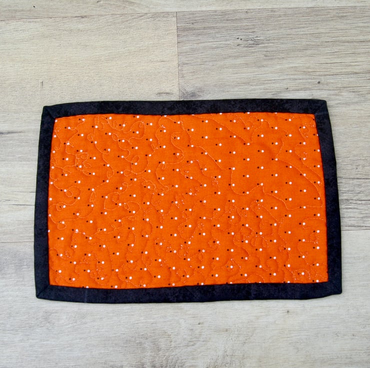 The front is a white fabric with a black appliquéd bat in the top left corner. You can chose between an orange fabric with white and black dots or an orange and black patterned backing. The two layers or cotton sandwich a cotton wadding. A black binding is used to accentuate the bat. The three layers are quilted together using a winding loop the loop pattern, with the word ‘Boo’ added occasionally to add to the halloween theme of the mug rug.