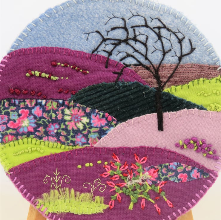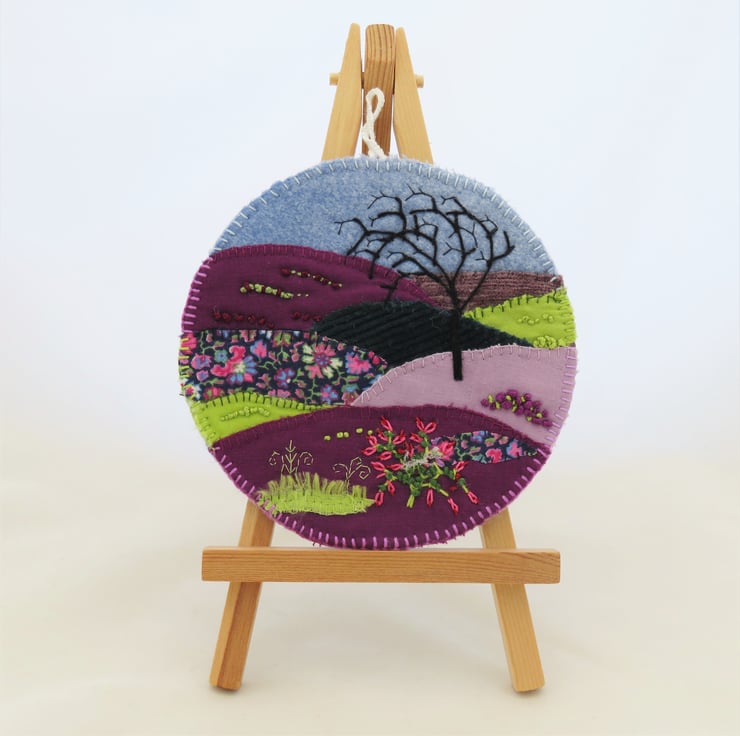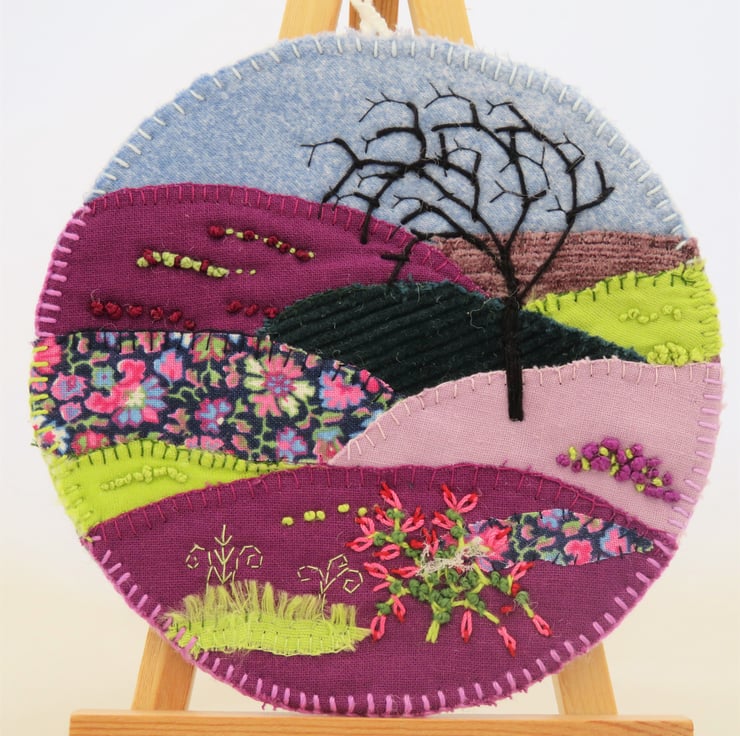 A pretty moorland scene of appliqued patches and hand embroidery.