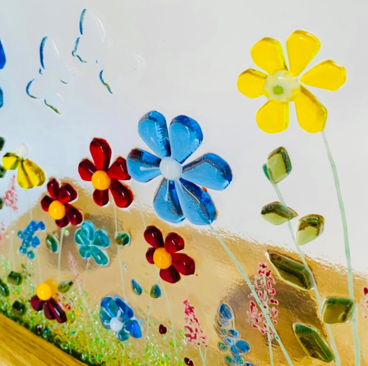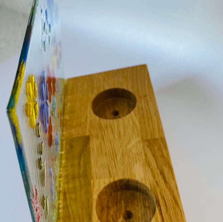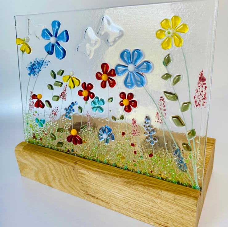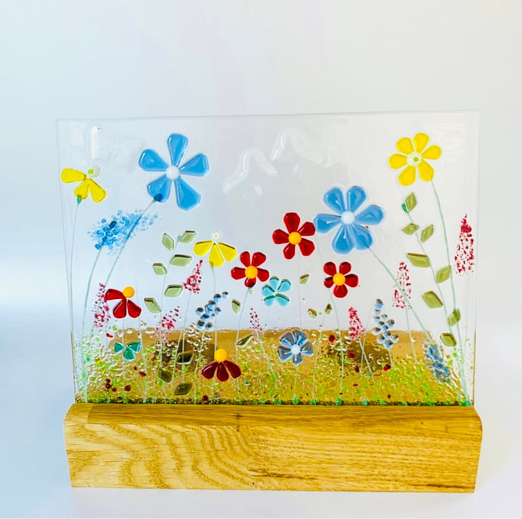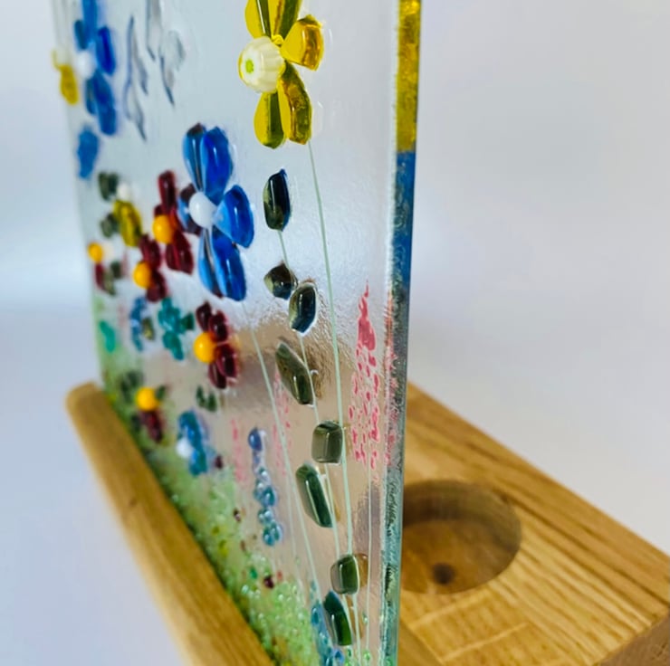 Stunning fused glass meadows art panel in a hand crafted oak base which has two recessed for candles so your fused glass art can be back lit by evening . Approximate size is 8inch high x 8 inch wide . All of my glass art is unique and you will never find another identical one . I have chosen vibrant glass colours for this piece as I wanted it to reflect summer .