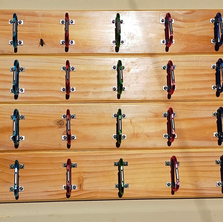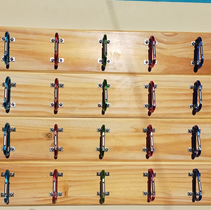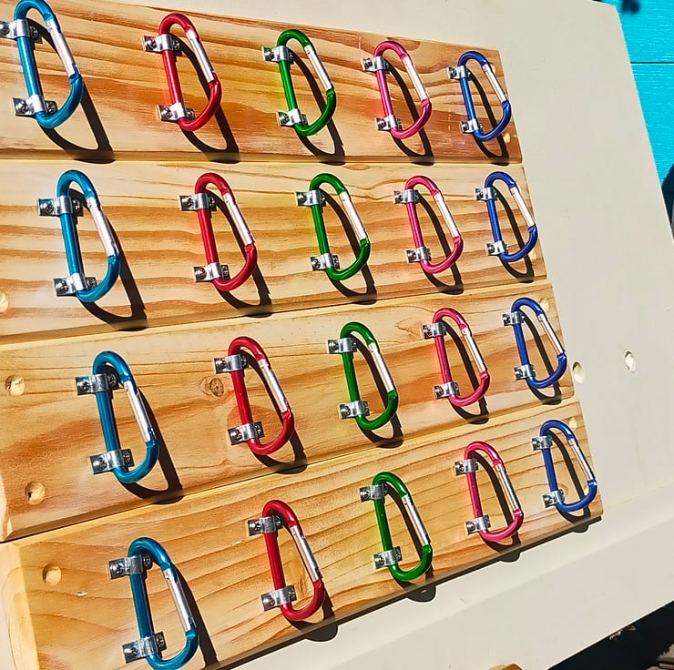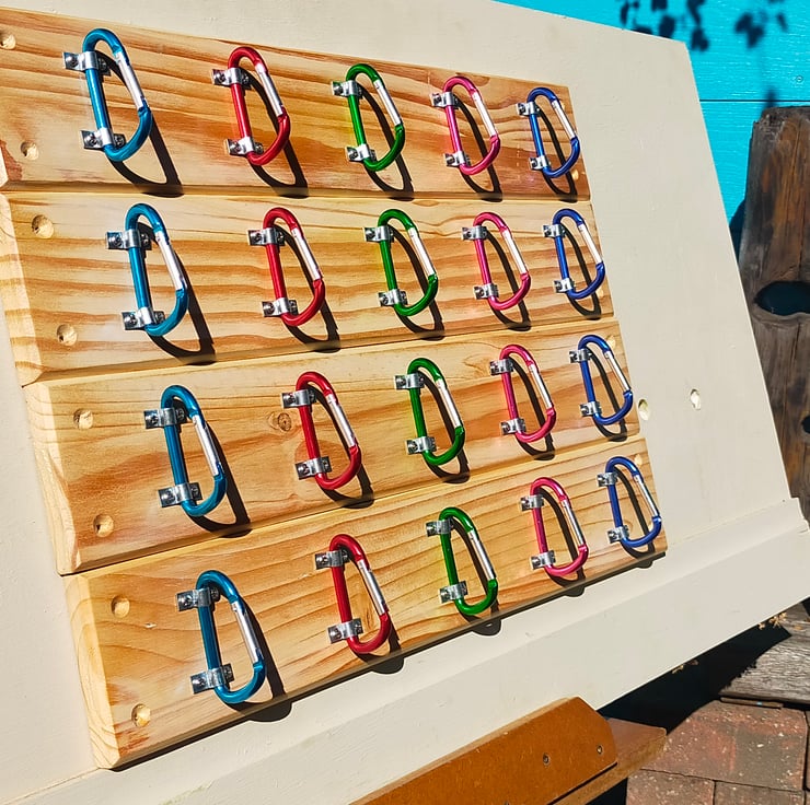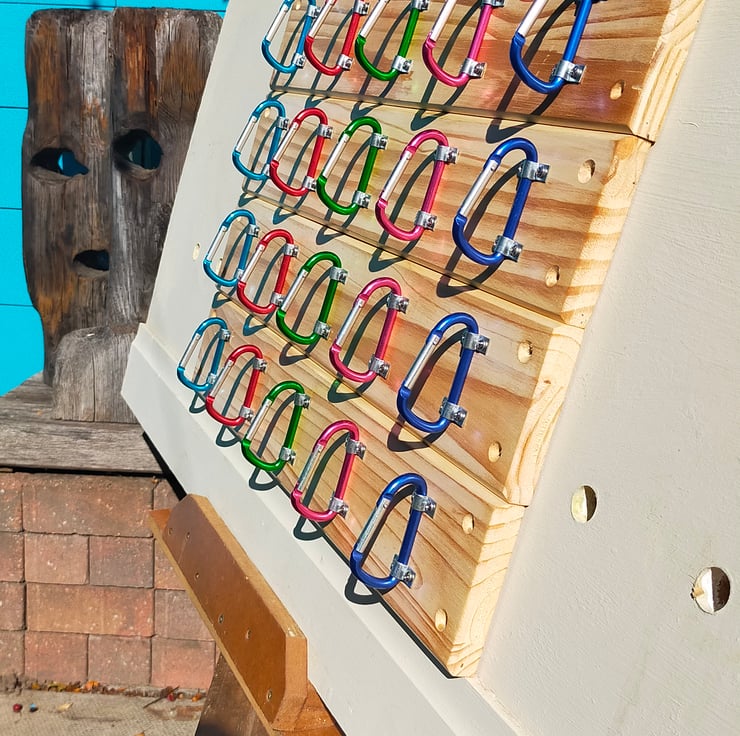 These are a bit of fun, but a brilliant gift for any outdoorsy type you may know. Five reclaimed carabiners of different colours are mounted onto a waxed backboard made from reclaimed pine door panels. Of course they could be used for the storage of ropes, kit, equipment as well as coats, adding a splash of colour and quirky individuality to a youngster's room. L 610mm x H 108mm x D 55mm.