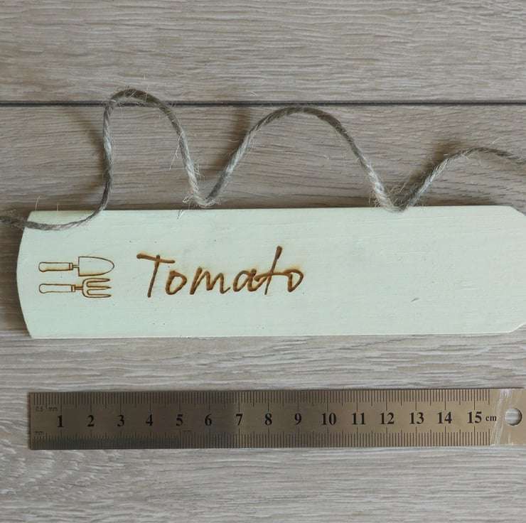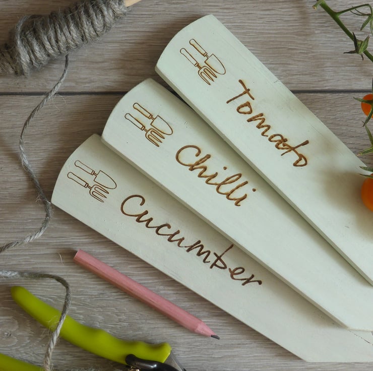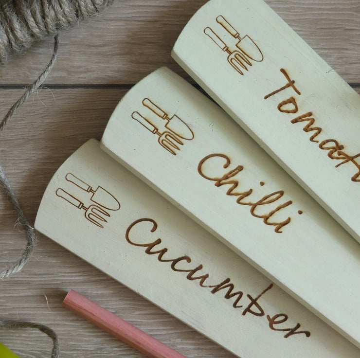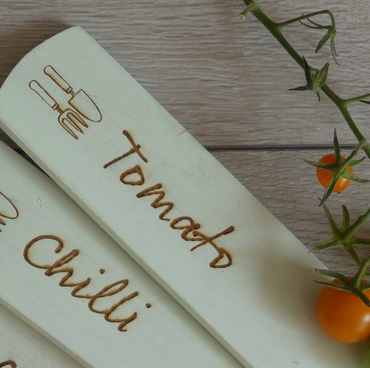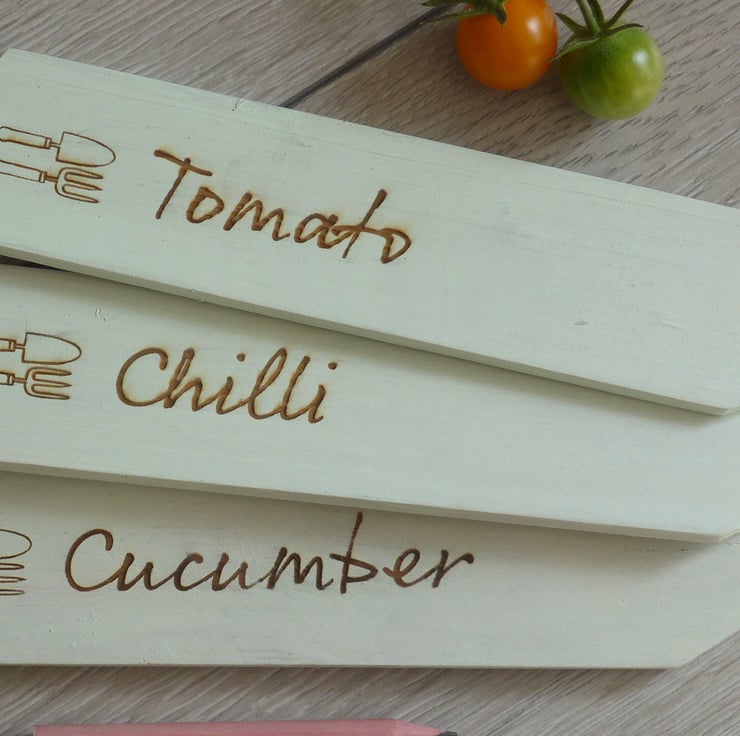 Each of the three labels comes with the name of the vegetable or herbs laser etched in a script font with a small trowel and fork decoration on the marker. Choose your vegetable or herb from the list in the 'choose options' section.