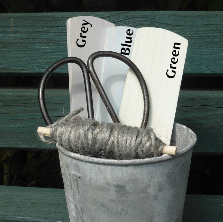 A pack of three wooden fsc pine plant labels with a light coat of garden paint, in pale green.