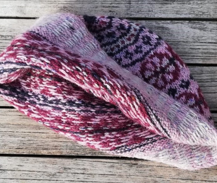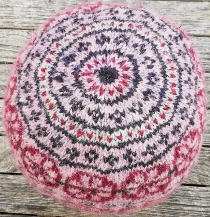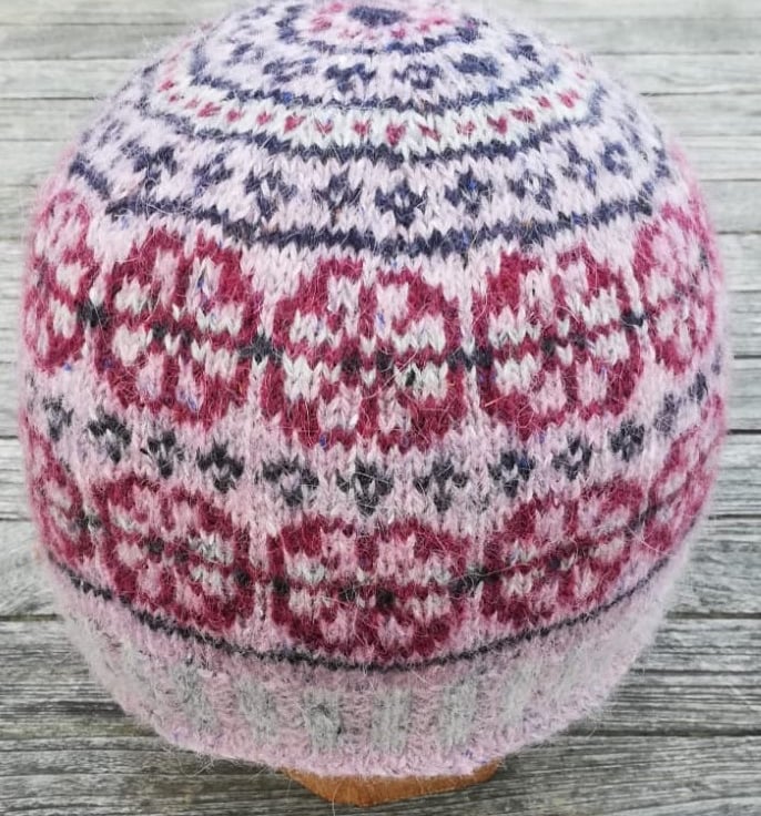 This pretty beanie with a flower motif is inspired by the breath-taking flowers of the Machair, we encountered whilst walking the Hebridean Way this summer. Designed in soft Rowan Felted Tweed, a fine DK, Merino Alpaca mix and knitted in the round on 3.50 needles, which are smaller than the recommended size making it snuggly warm with good stitch definition. The flower motif is a 12 stitch repeat and the peerie patterns on the crown are a simple 4 stitch repeat. The pattern is illustrated with photographs and clear charts and is suitable for a knitter developing their Fair Isle skills.