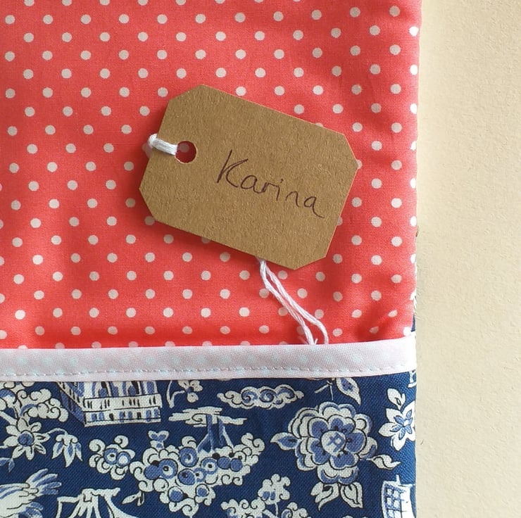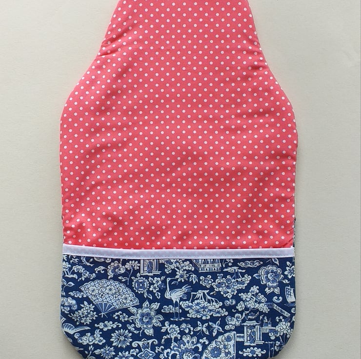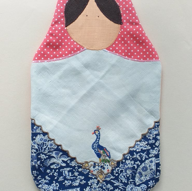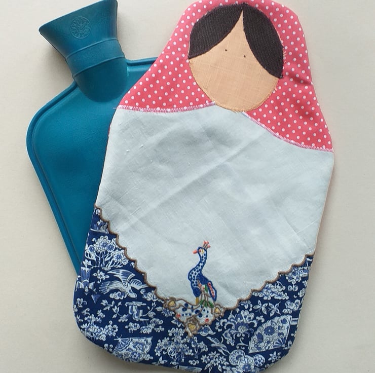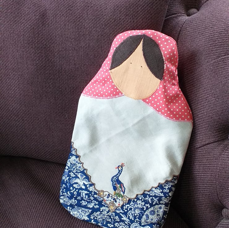 A sweet hot water bottle cover in the shape of a Matryoshka style doll. Made from cotton, Karina has a shawl in spotty coral pink, an apron made from an embroidered napkin with a beautiful peacock, and a lovely blue dress. She is lined with fleece and fits a standard sized water bottle. The back has an envelope opening with a pink spotty binding along the edge.