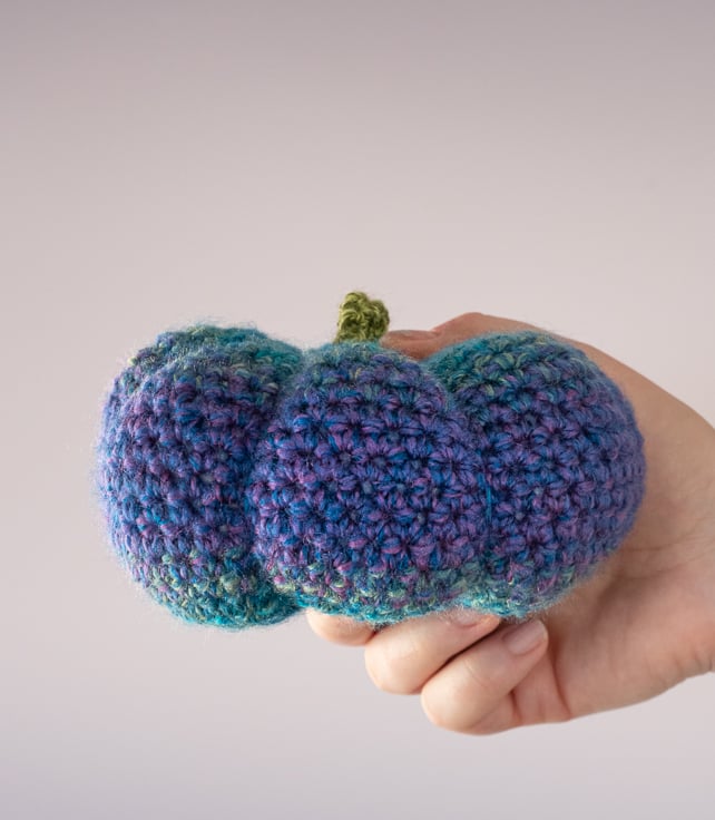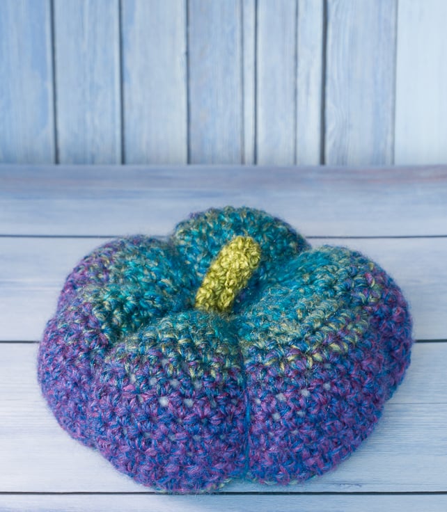 It's handmade from premium acrylic yarn in a blue/green/purple mix. It is stuffed with toy stuffing.