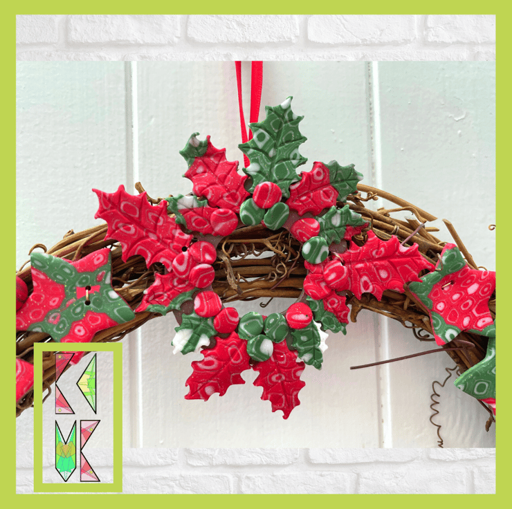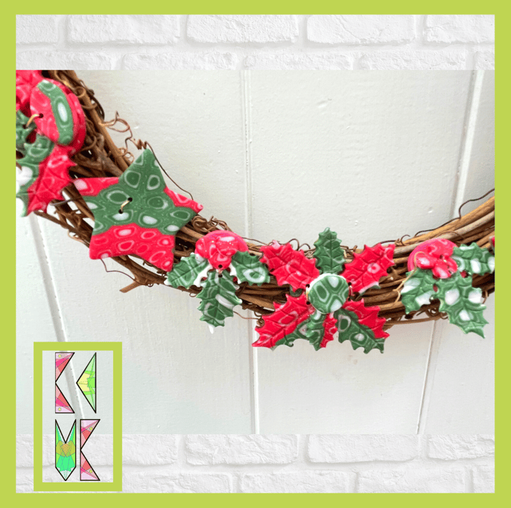Each clay decoration has been cut from my own handmade canes, which I slice and lay out to create random patterns. No two pieces are ever the same! They are attached to the 25 cm rattan wreath with tarnish resistant copper wire. A red satin ribbon is threaded at the top for hanging.
