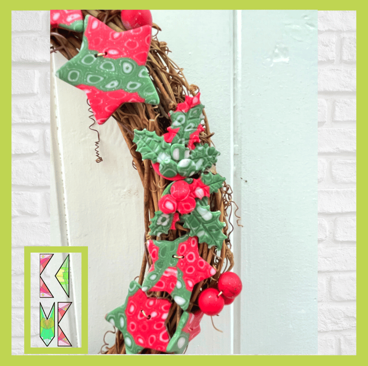 Rattan wreath decorated with festive handcrafted polymer clay mini-wreaths, stars, holly leaves, and baubles.