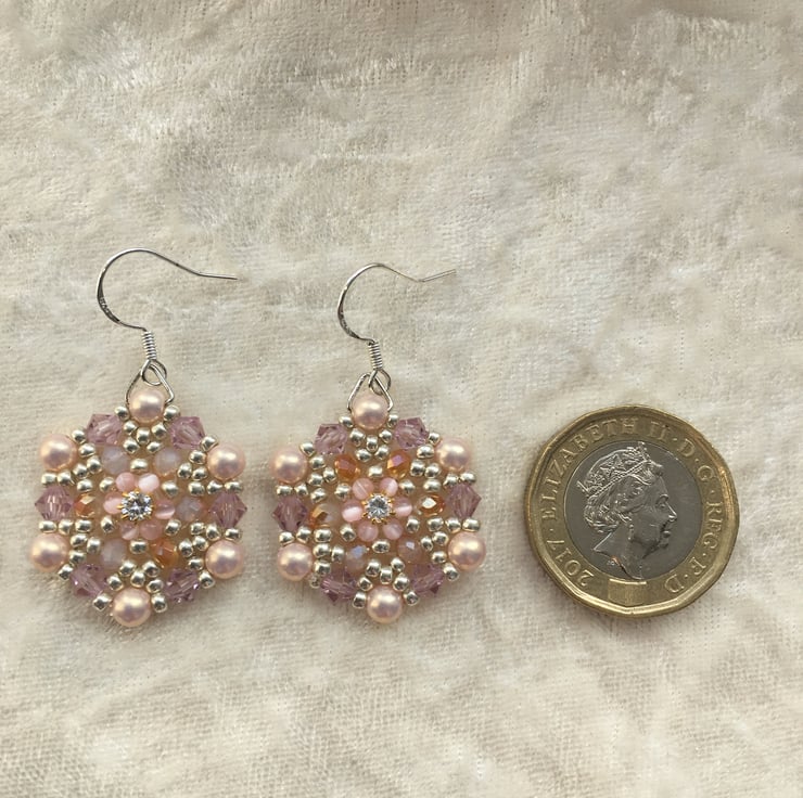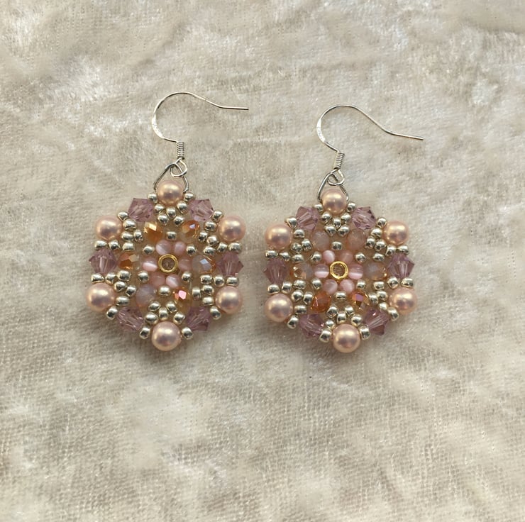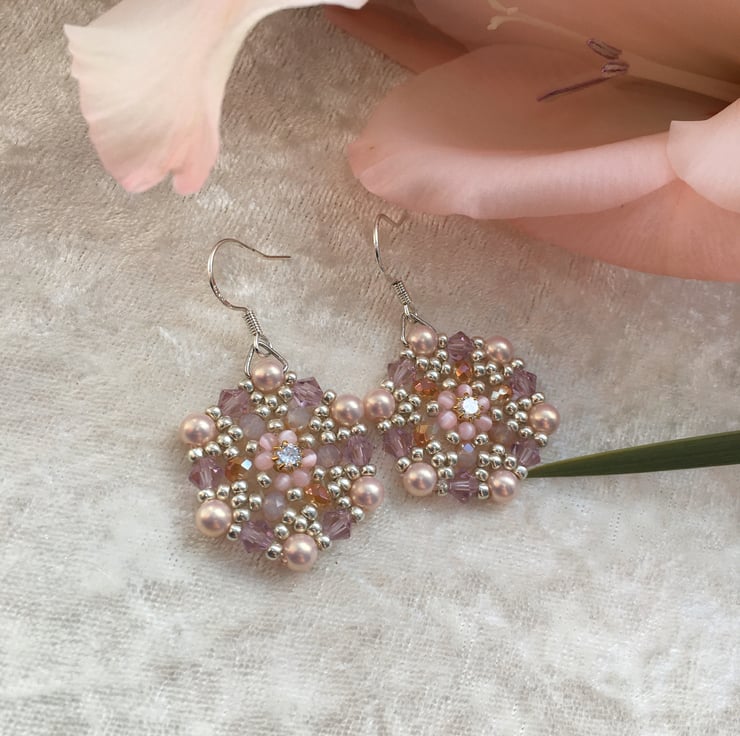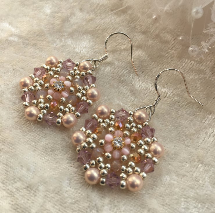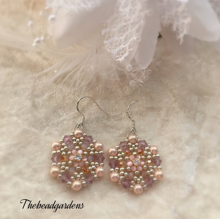 A gorgeous earrings made by hand weaving with Swarovski crystals,Pearl beads, Japanese seed beads and a cubic zirconia in the centre.