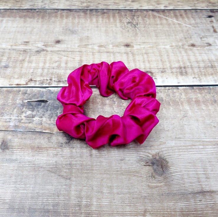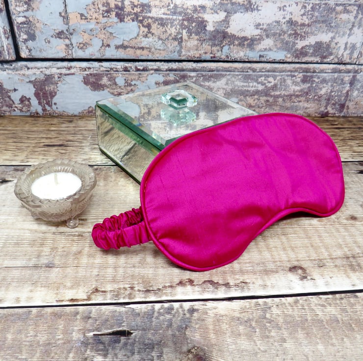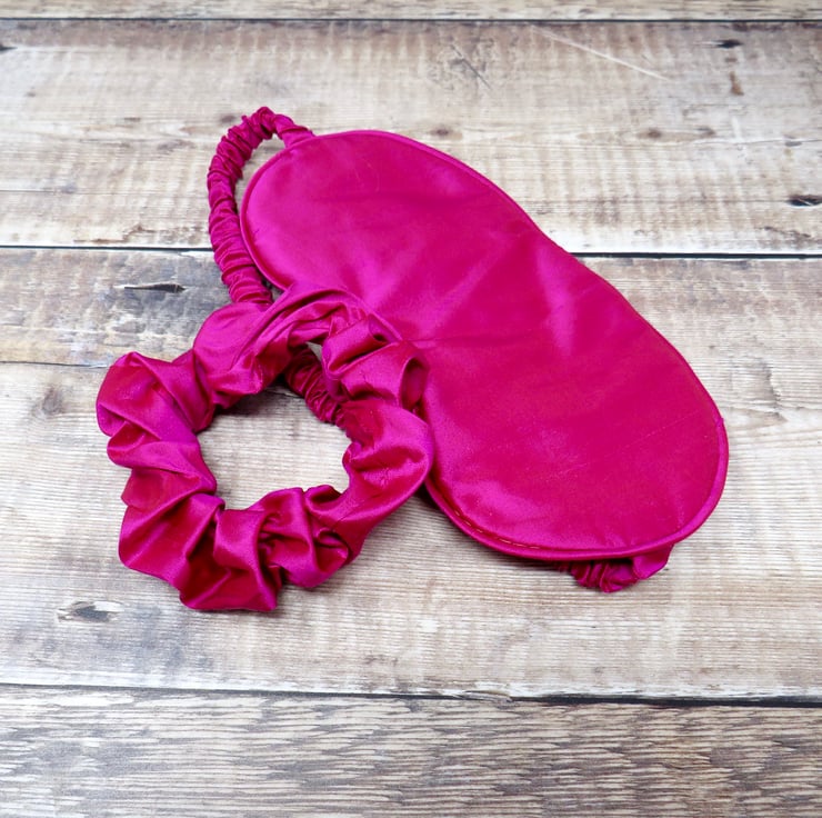 This luxurious sleep mask and scrunchie set has been handmade in a lovely cerise silk dupion. The soft silk mask has piped edges and soft elastic for a comfortable fit. It's padded to keep out ambient light and aid restful sleep. The scrunchie will keep your hair off of your face without causing damage. This lovely gift set is presented in a gold organza bag.