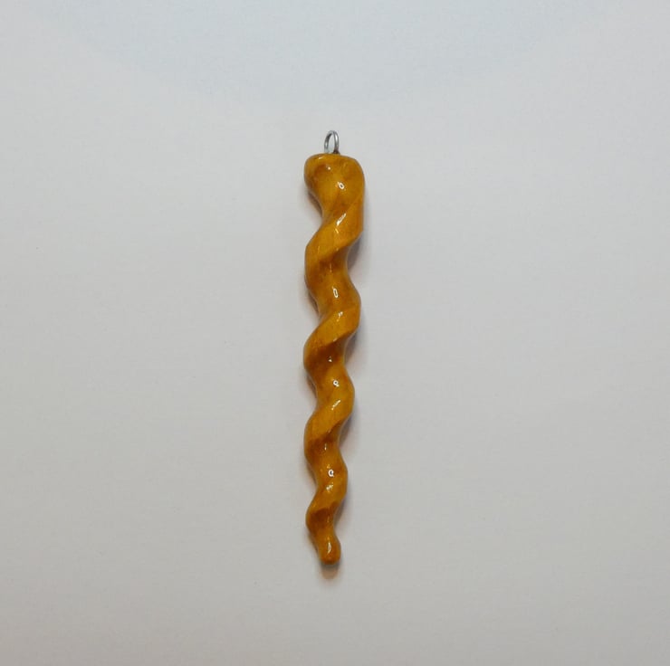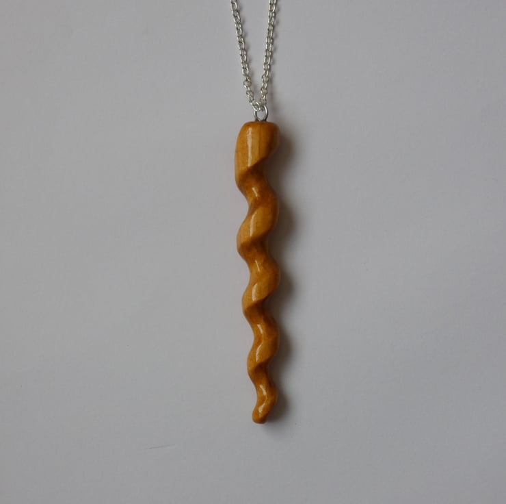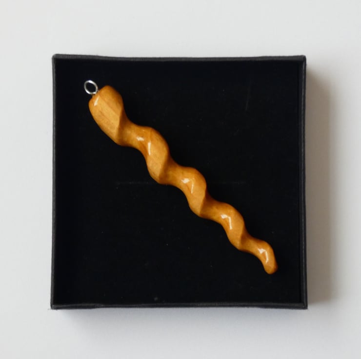 This pendant was cut and shaped from a piece of wood, using a scrollsaw, before being sanded to a smooth finish. It was then further shaped using a rotary tool. The pendant is smooth to the touch and has been finished with several coats of Lacquer to enhance the grain whilst also protecting the pendant. The lacquer is water and heat resistant.