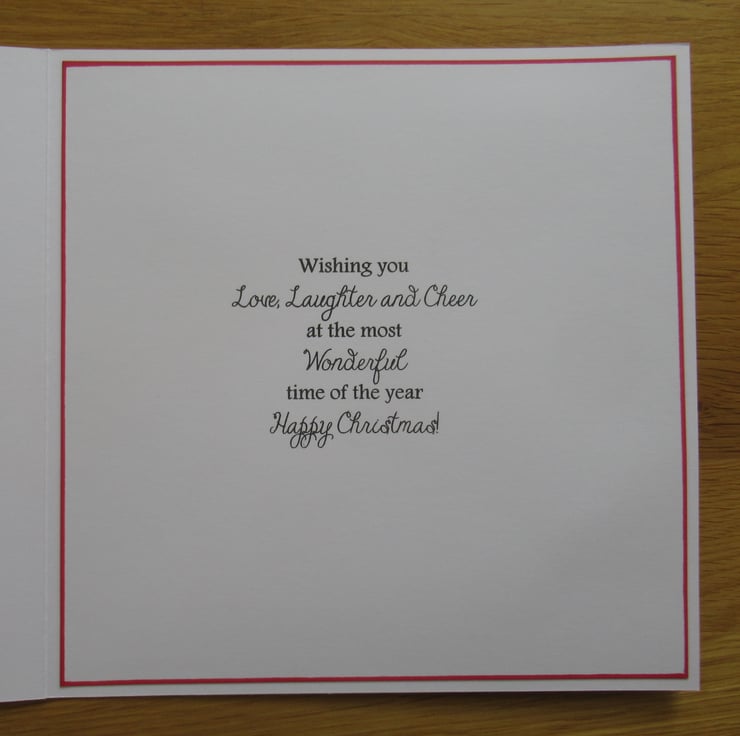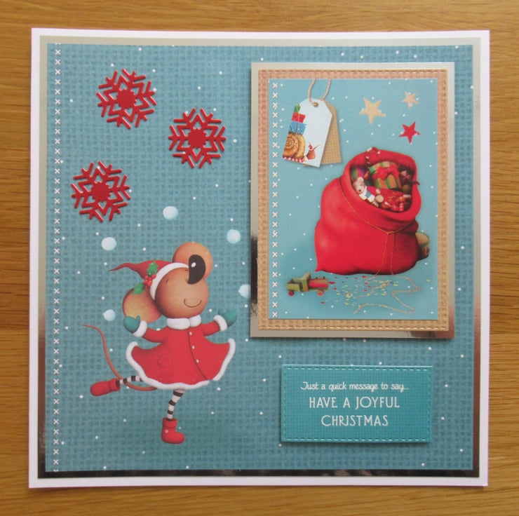 This cheekly little card in blue and red, features the image of a cute little mouse dancing in her red dress, and a smaller image of a sack full with presents. The smaller rectangular image has mats and layers of silver and beige and this is raised with 3D foam pads. The background card has a mat of silver mirror card behind it and to finish the card, there is a christmas greeting which has also been raised with 3D foam pads and 3 die cut snowflakes. The inside is finished to coordinate with a stamped verse as pictured.
