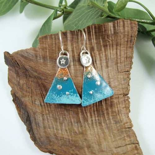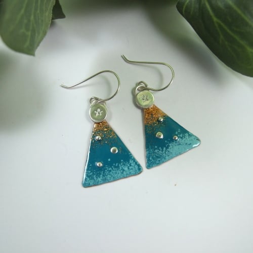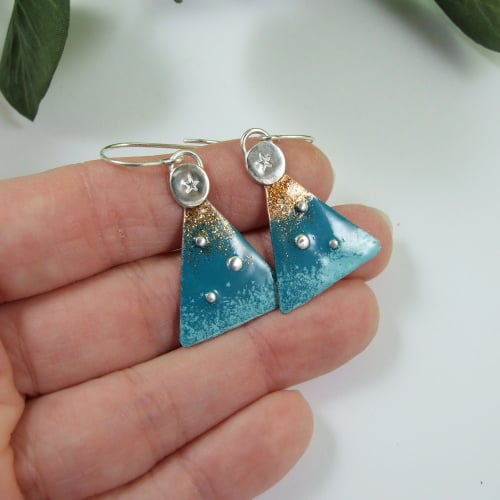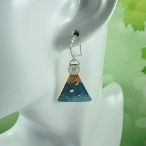 I have cut the base triangle from copper sheet then added a silver bail with a hand stamped star. The tree has been given 3 different coloured layers of low temperature Efcolour enamels which are fired in a regular oven, they start out as a very fine powder which becomes liquid as it heats and sets glossy and embedded tiny silver beads for baubles. Fitted to sterling silver earwires.