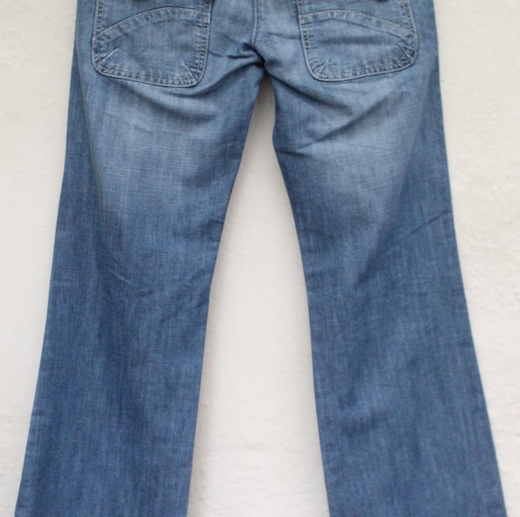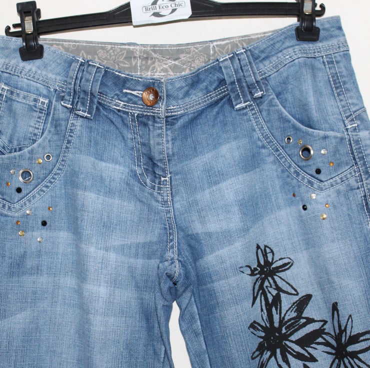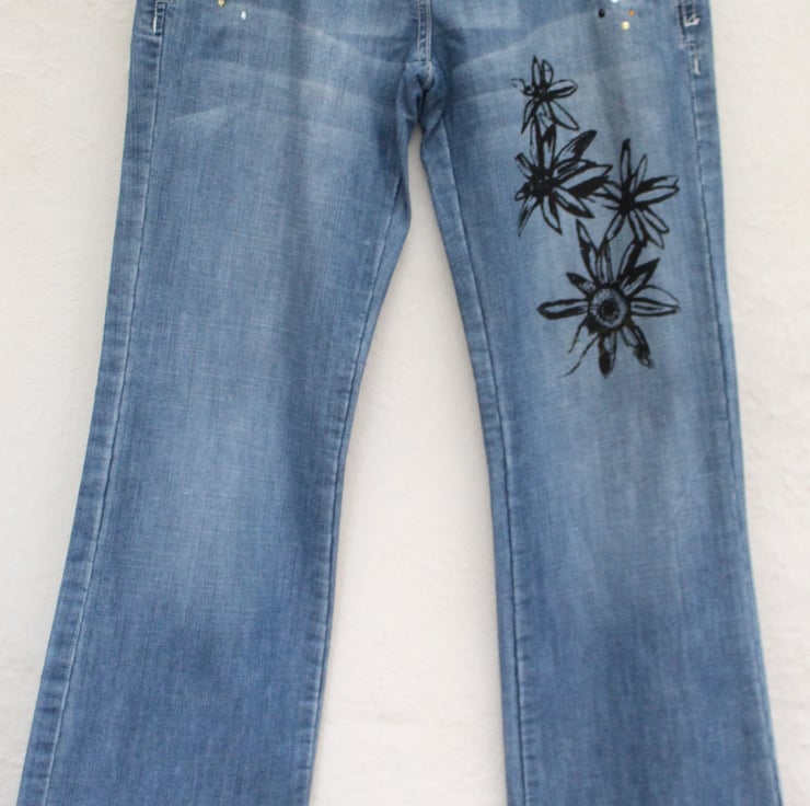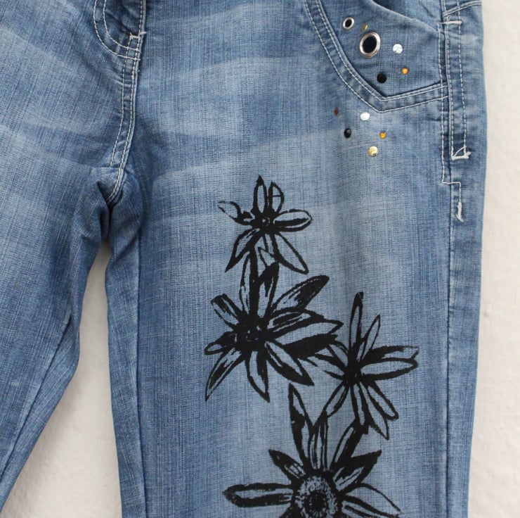 Ladies UK SIZE 8 Falmer hipster jeans, reworked 90's vintage jeans, the jeans have been reworked and hand screen printed with my unique floral design.