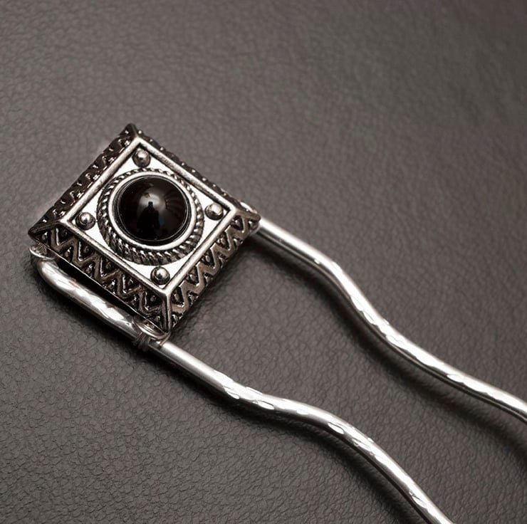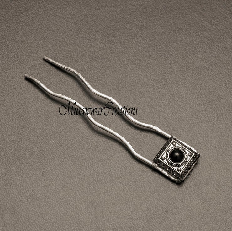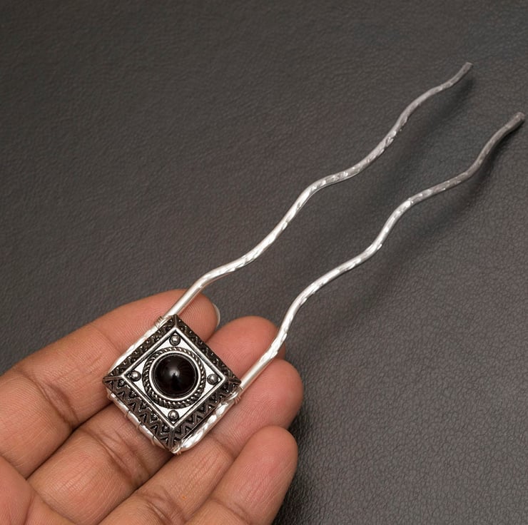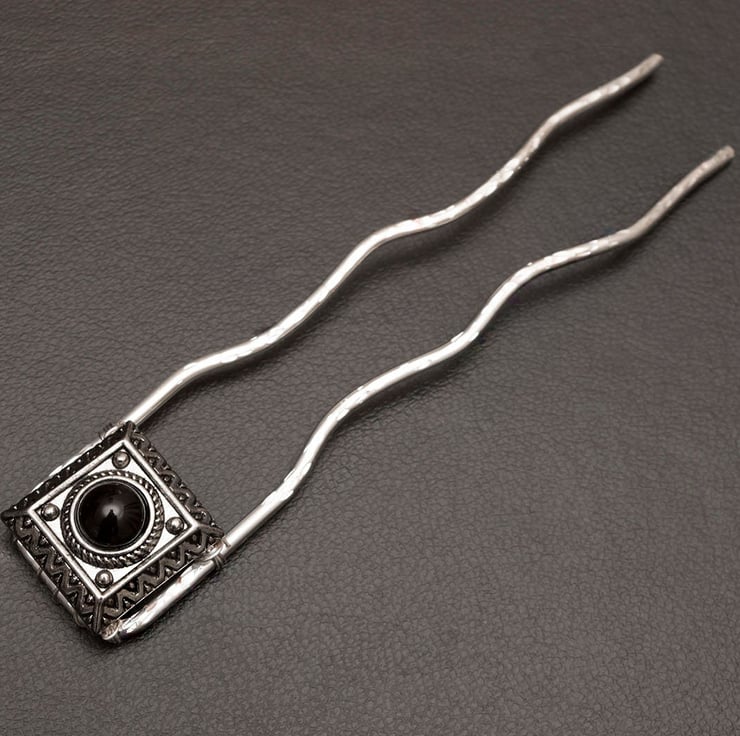 This beautifully crafted hair fork features a striking square antique-silver charm paired with hand-formed silver-plated wire prongs. Designed with both style and durability in mind, it makes a timeless accessory for securing buns, twists, and elegant updos.