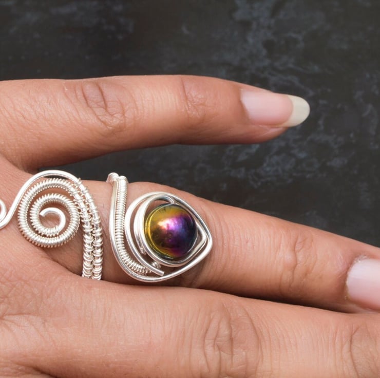 This unique finger ring is the perfect accessory whenever you want a stylish and distinctive look. Handcrafted from 1.25 mm silver wire and wrapped with fine 0.4 mm wire, it features a striking 10 mm rainbow-coated black agate round stone that catches the light beautifully.