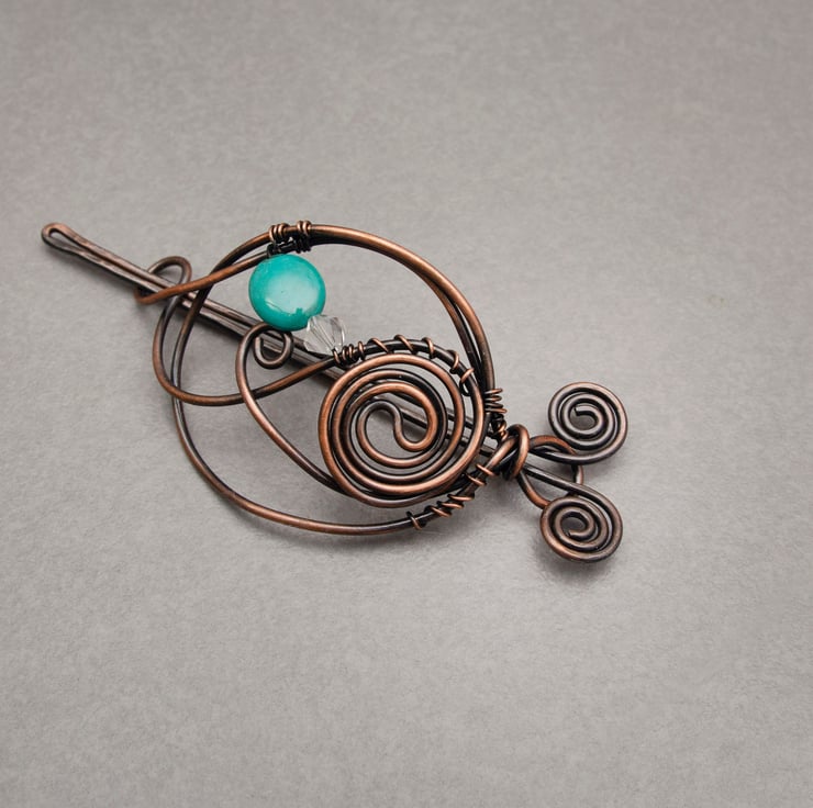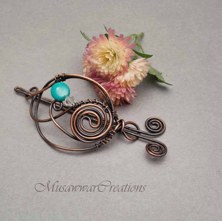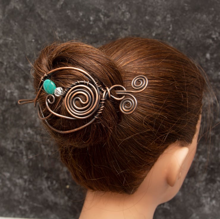 The spiral is elegantly wrapped with a turquoise agate gemstone (approx. 18x13mm), adding a pop of vibrant color and natural beauty. The rich tones of antique copper paired with the calming blue-green hue of turquoise create a stunning accessory that complements any outfit or occasion