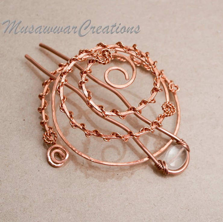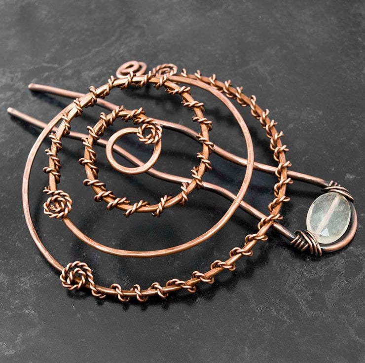 Each bun holder is made from heavy-duty solid copper wire, wrapped with 1.5mm twisted copper detailing for strength and style. The U-shaped fork pin is adorned with a clear faceted oval agate, creating a graceful and sophisticated look.