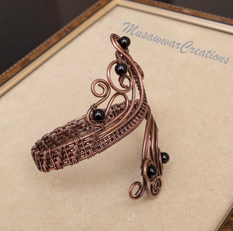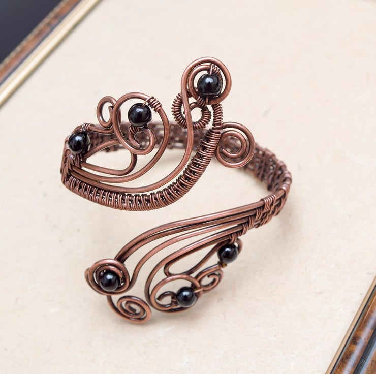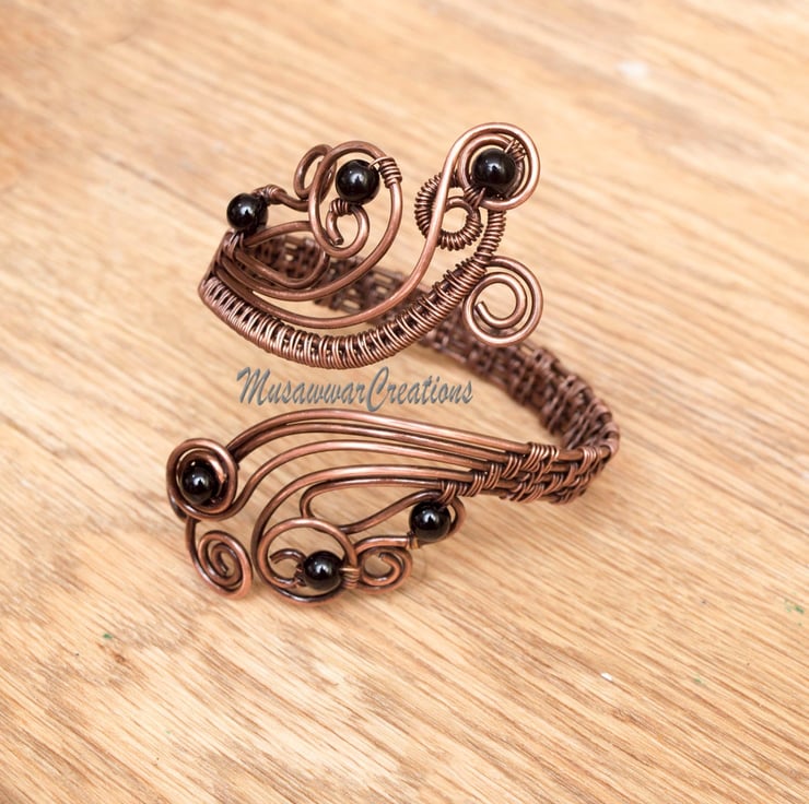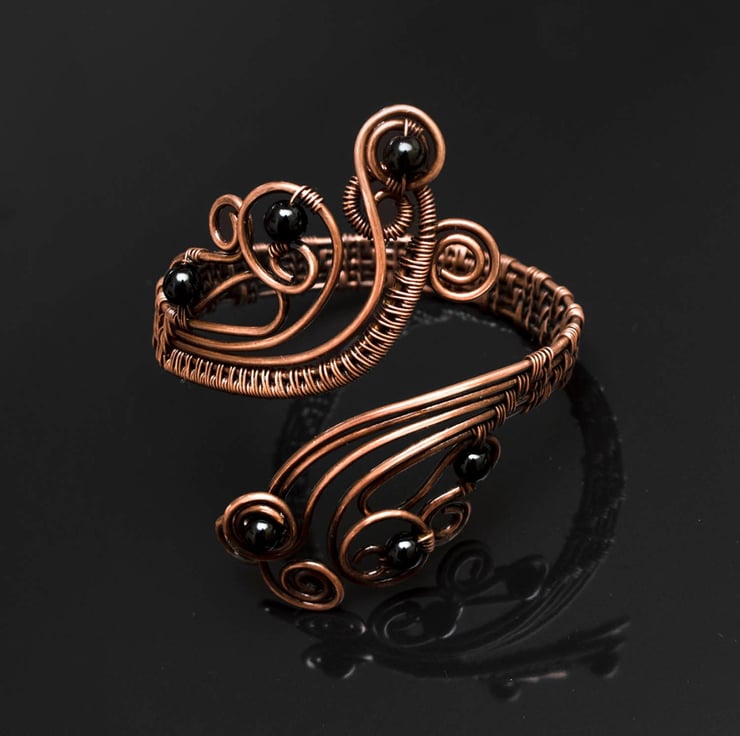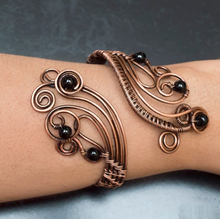 Each piece is carefully shaped from thick pure copper wire, wrapped with polished black agate beads, and oxidized to give a rich, antique finish.