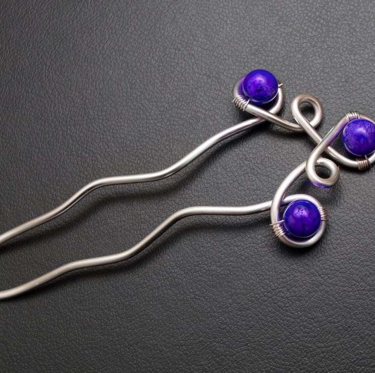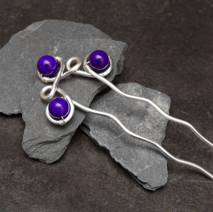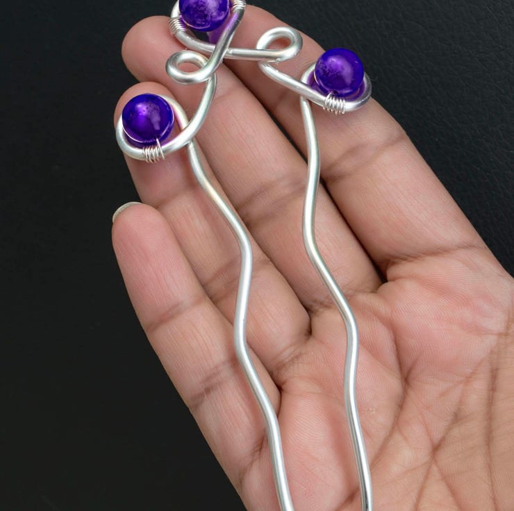 This Celtic knot hair fork hand made with thick guage silver plated copper wire and wrapped with Dyed purple magnesite 10mm gemstone.