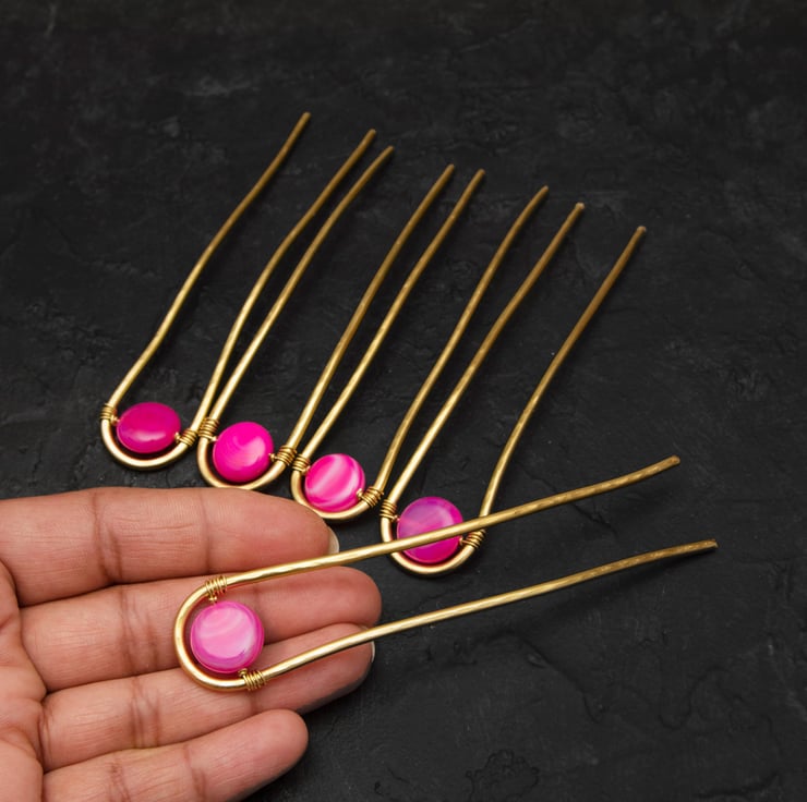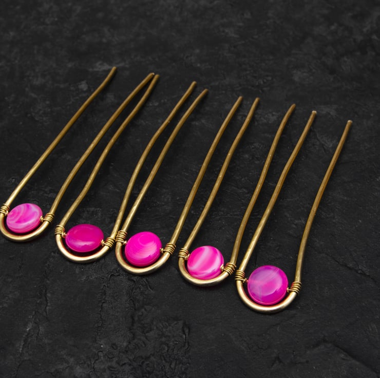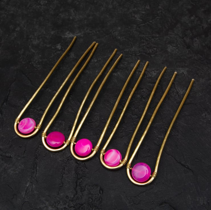 A gorgeous set of 5 hair pins with the gemstone Hot Pink Banded Agate Puffy Coins is approx 14x14mm
