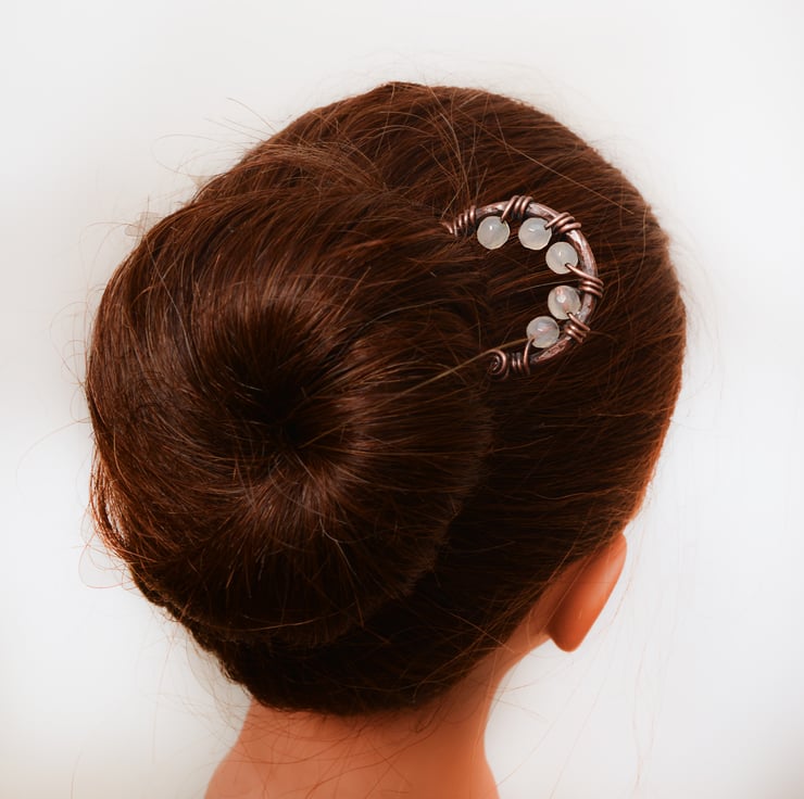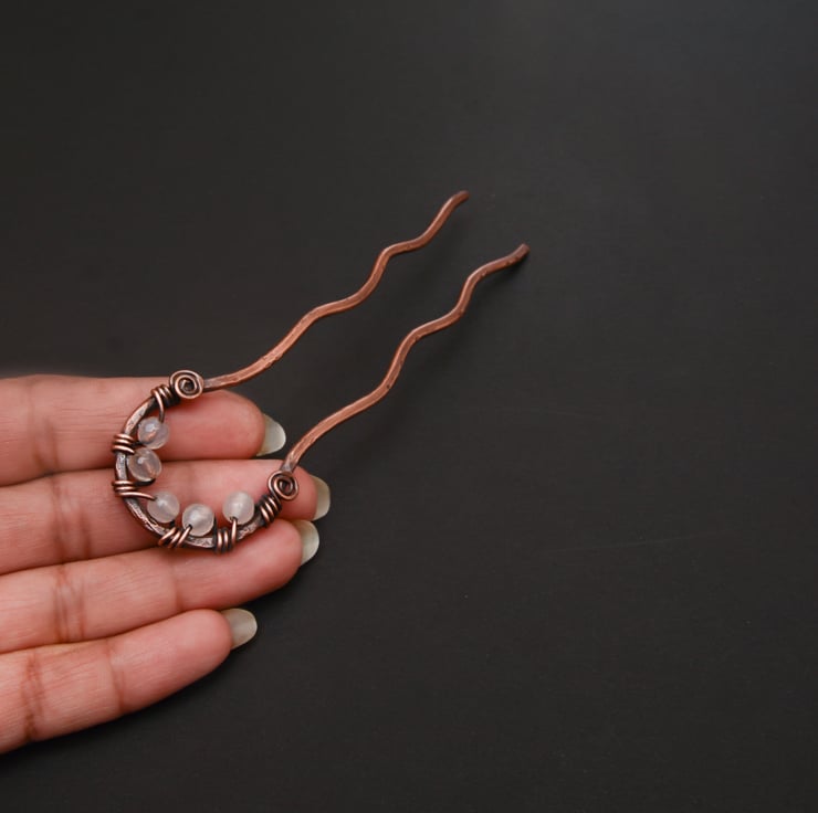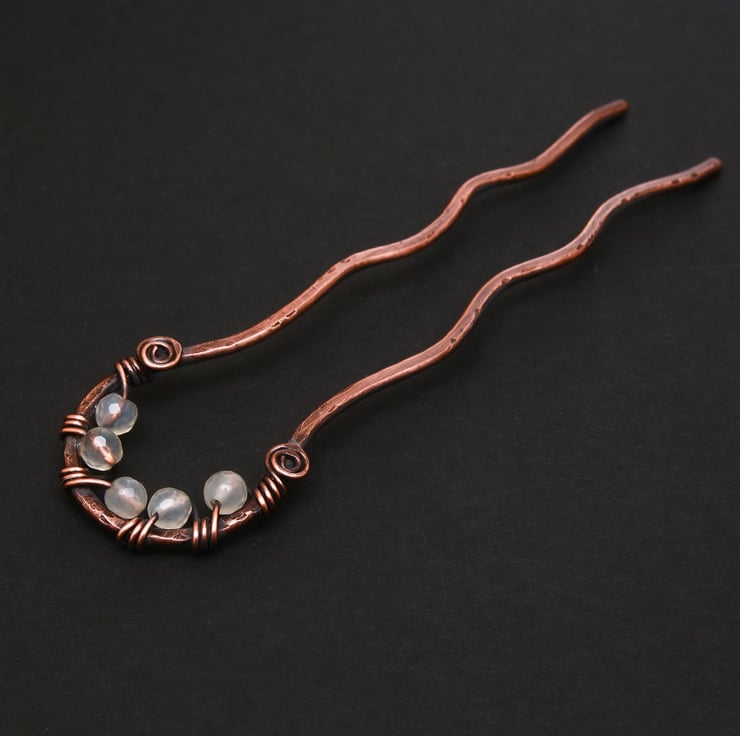 Hair forks are hand made from 2.5 mm solid copper wire and wrapped around to white agates.It is hammered ,textured and than oxidized .