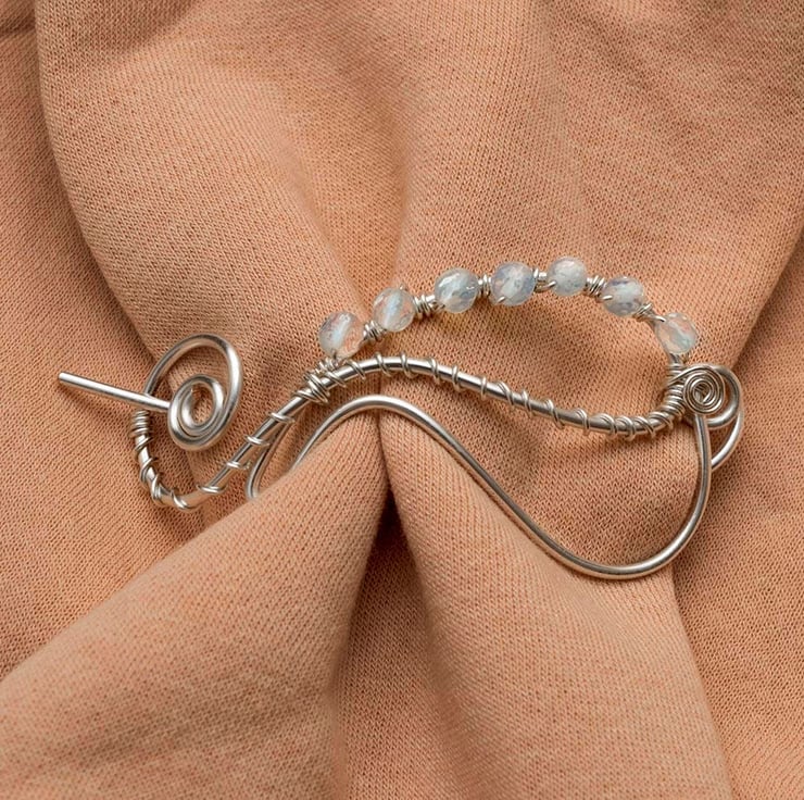 Opal moonstones shawl pin,silver wire scarf pin, sweater pin, swirl design shawl