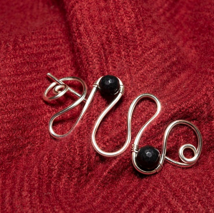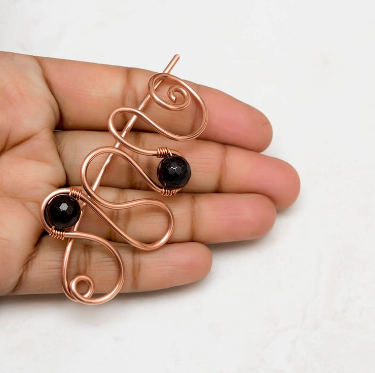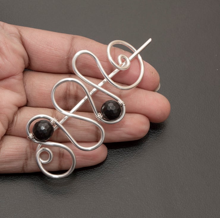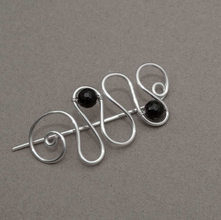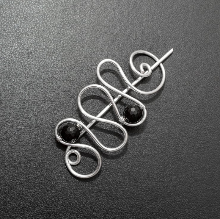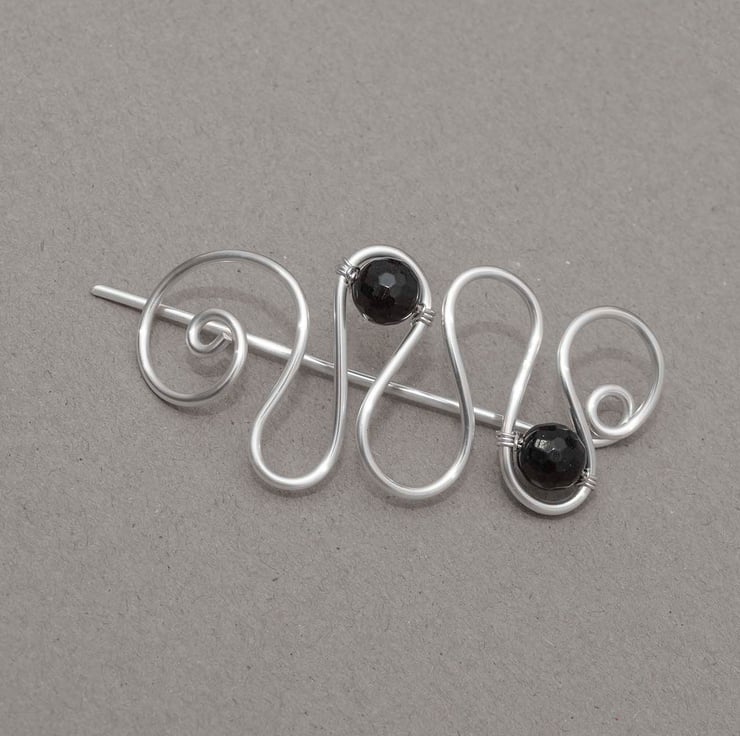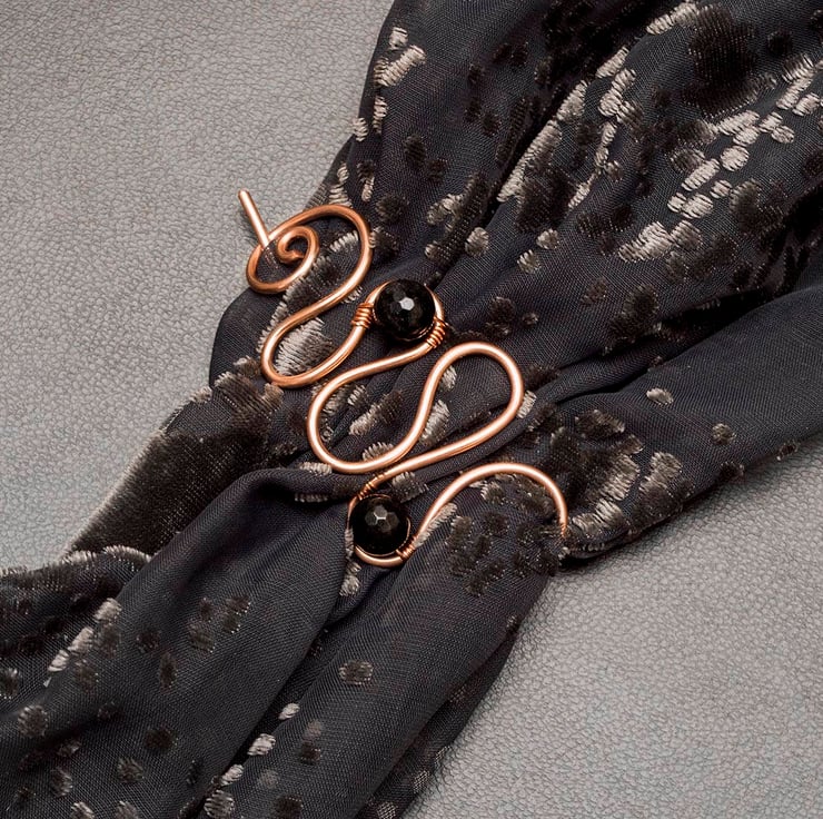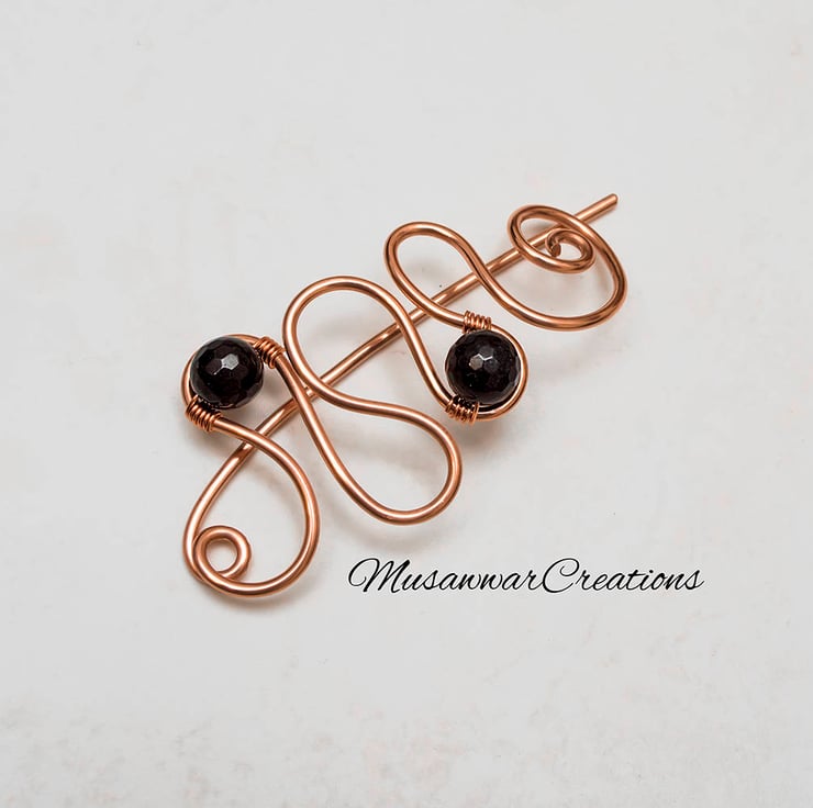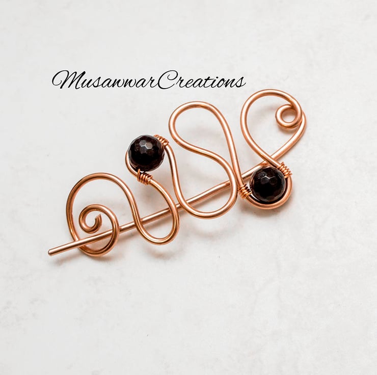 This pretty copper shawl pin is wire wrapped with black faceted quartzs.