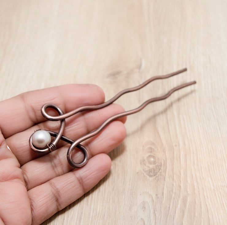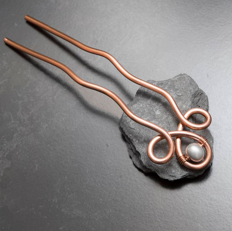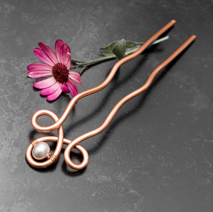 The hair fork are hand shaped with thick guage copper wire and wrapped with fresh water white pearl.