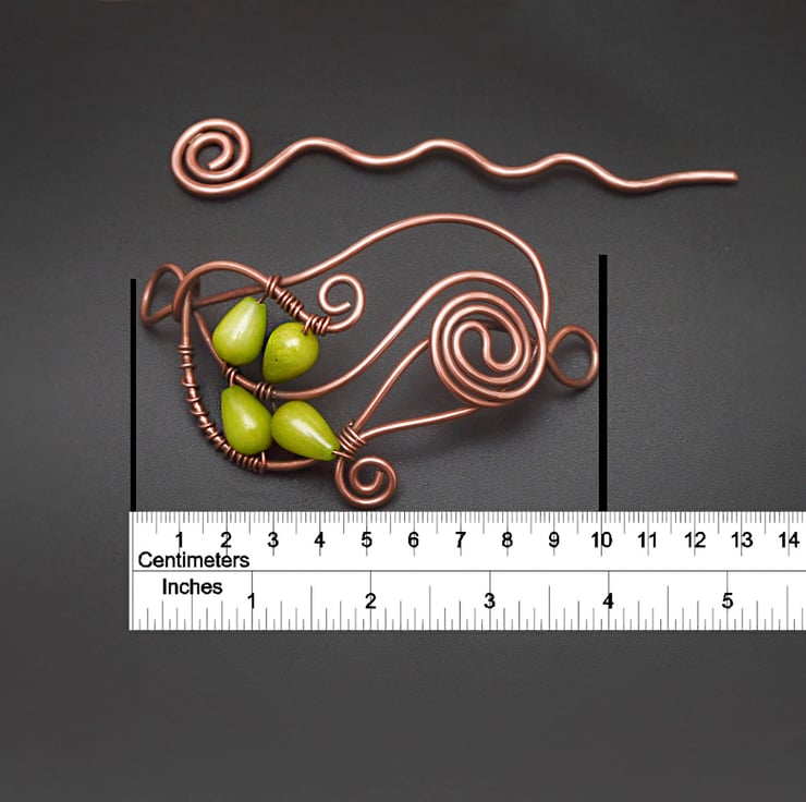 Each bun holder is individually wrapped with a leaf-green teardrop quartz, giving it a beautiful natural shimmer that complements the warm tones of the copper.