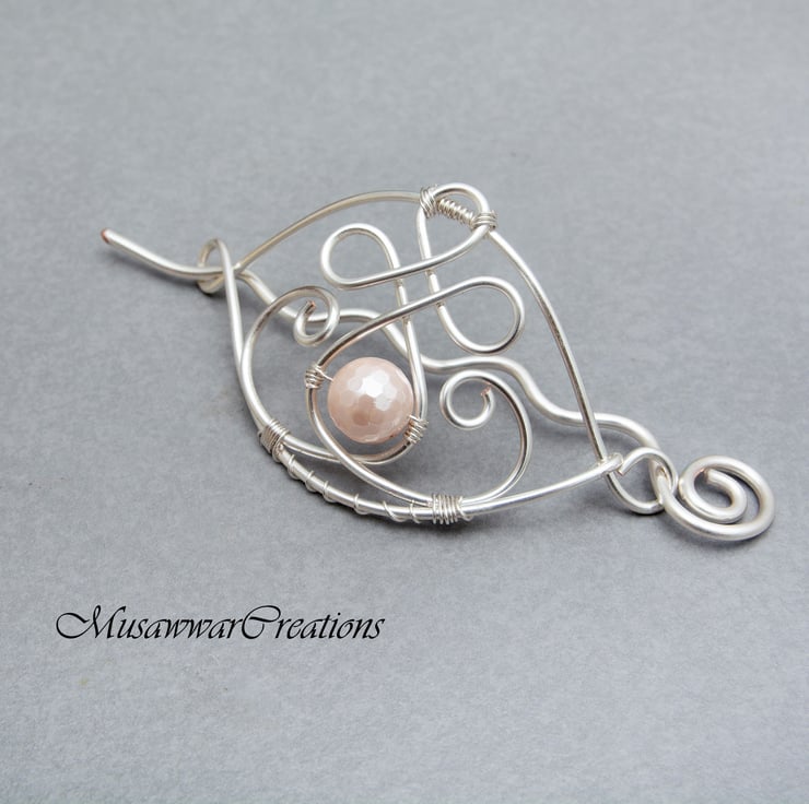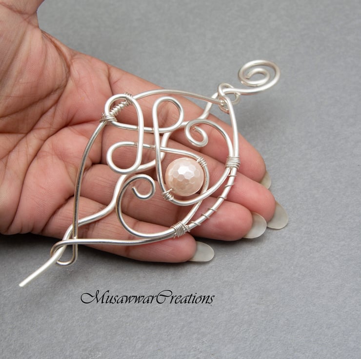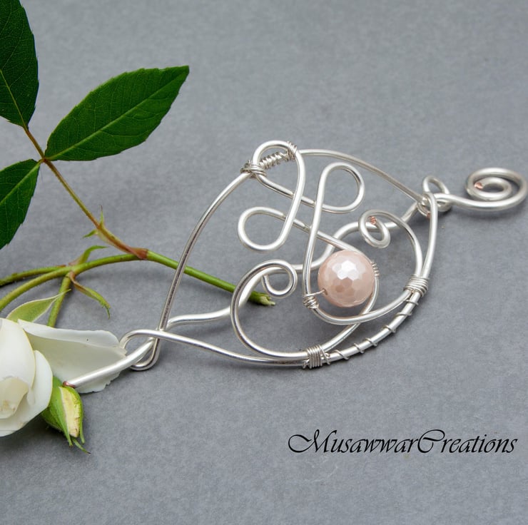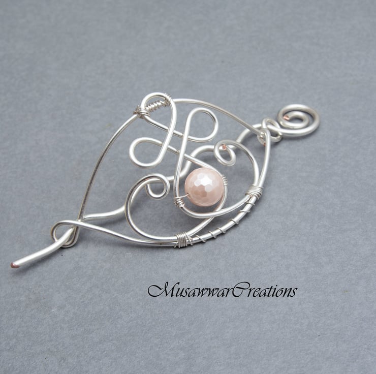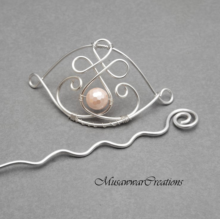 Beautiful elegant hair bun slide made of silver plated copper wire and wrapped with rose pink shell pearl.